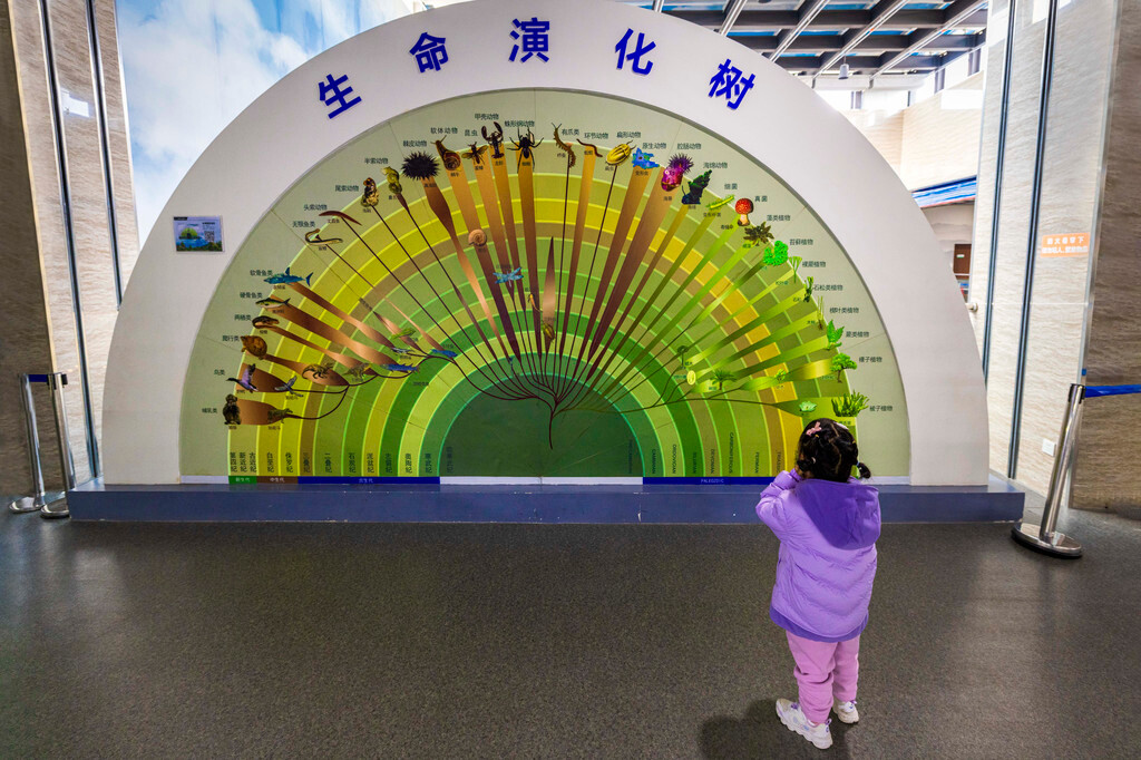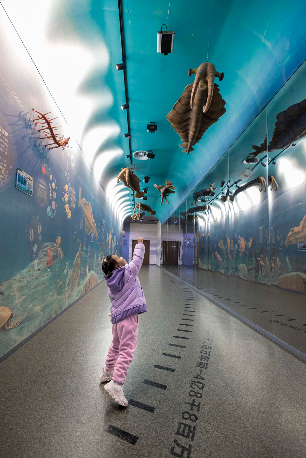 二楼展示区更多是辽西以及其他地方收集过来的还是展品陈列在一起,多数都属于白垩纪时代同期生存的古生物,围绕一圈哈妮最感兴趣的是远古海洋的长廊,一面是镜子,上方悬挂着寒武纪明星动物“史前海洋奇虾”模型,如果现在这种虾还活着,哈妮是断然不敢吃虾了。