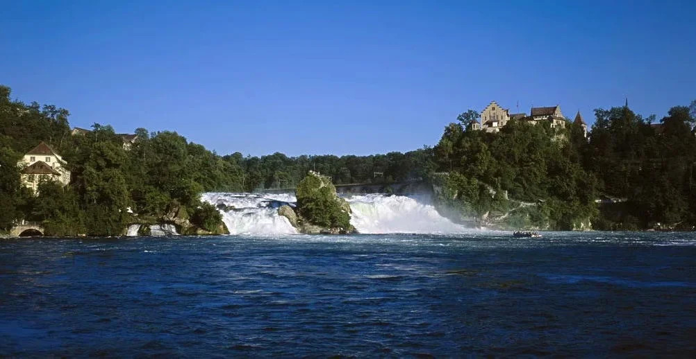 睡到稍晚一些,便退房去瀑布景区。到了停车场一看,已经是人声鼎沸,各地游客纷至沓来。在公路旁的桥上已经可以看到瀑布的远景和听到瀑布的喧嚣。沙夫豪森的莱茵河大瀑布。它位于波登湖的瑞士北部,距离州政府沙夫豪森约4公里。在莱茵河上游全部落差约30公尺(100呎),宽150公尺(492呎)。一块柱状岩石把瀑布分成两个主要部分,位于河右岸的落差约15公尺(50呎),左岸约20公尺(65呎)。莱茵河瀑布是莱茵河在其1300公里的流程中唯一的一个瀑布,也是欧洲最大的瀑布。它宽150米,落差23米,流量达到每秒700立方米。