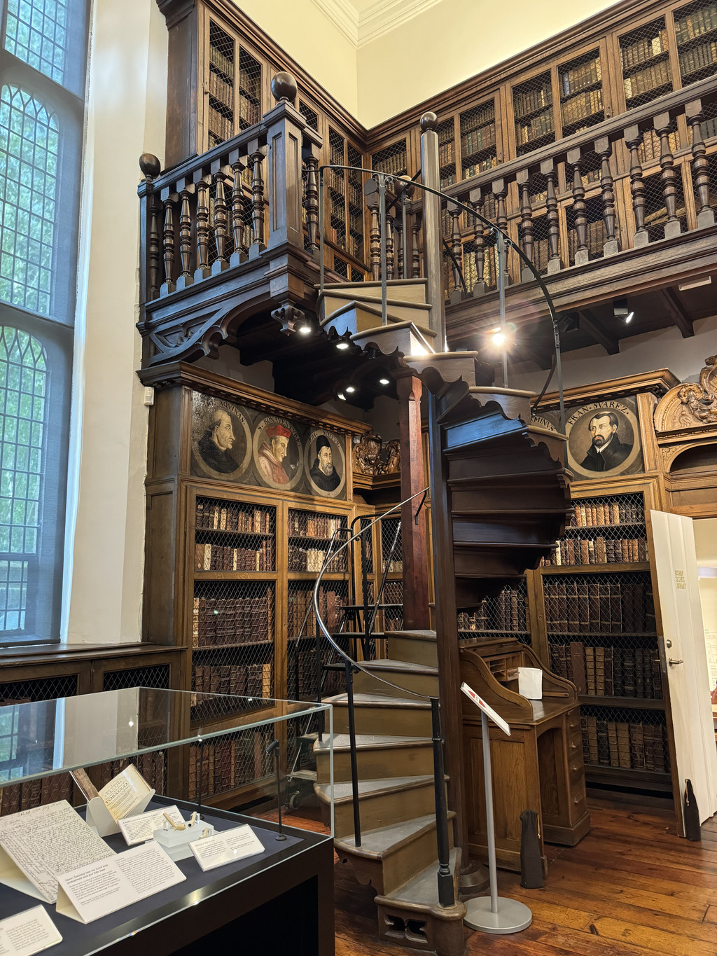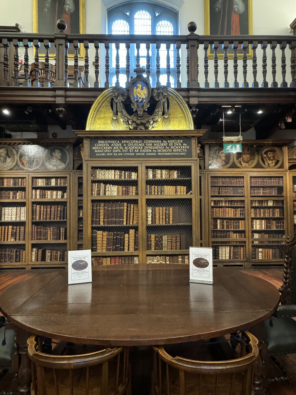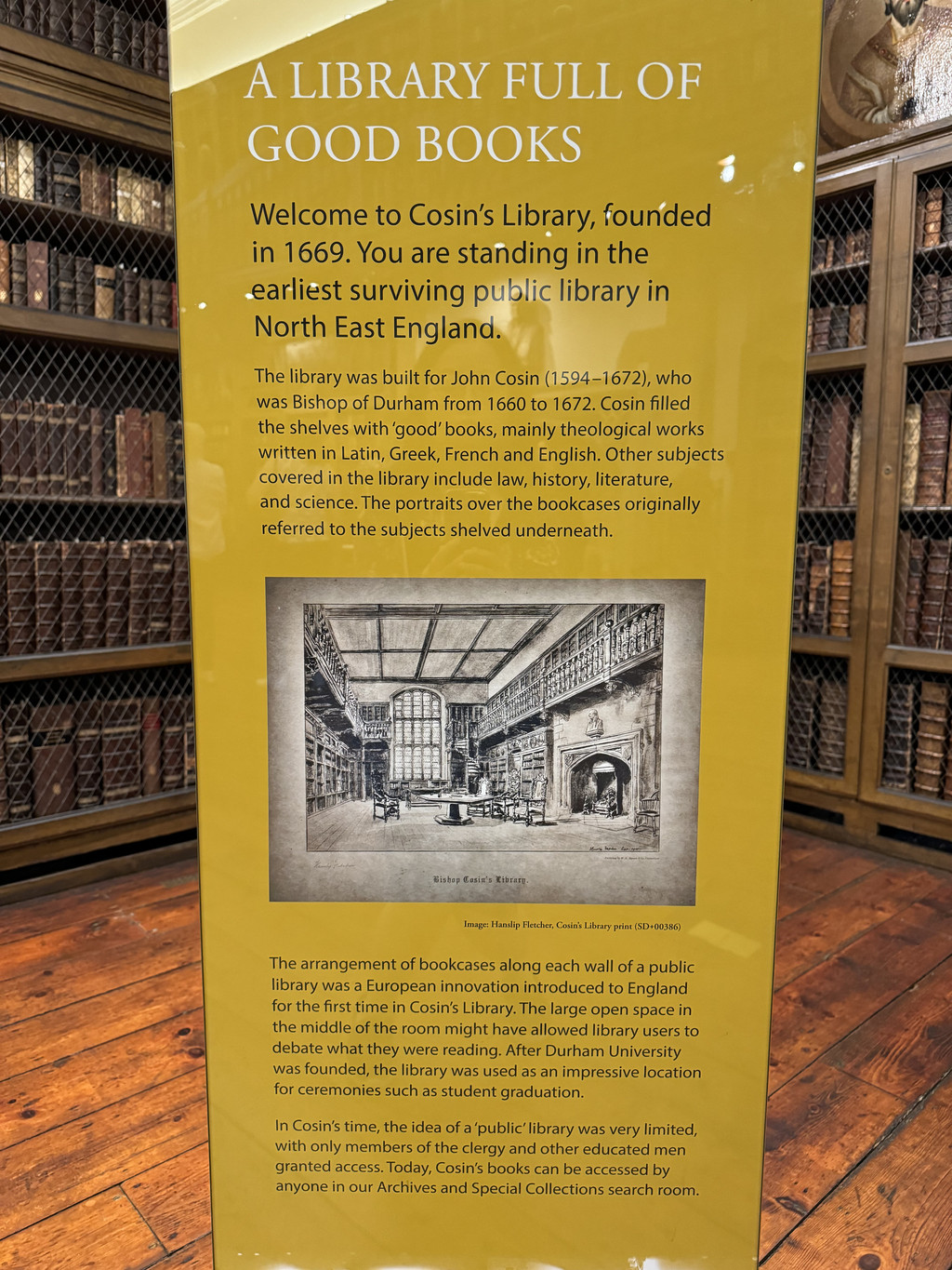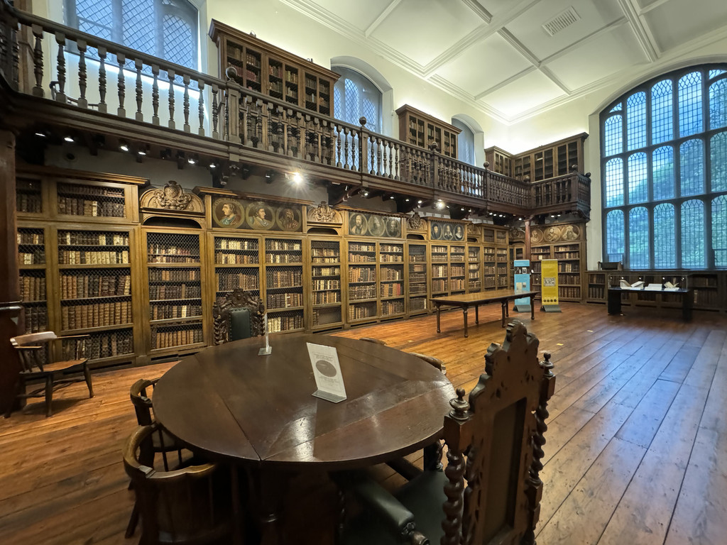 大教堂与城堡之间还有一座隶属于杜伦大学的图书馆Palace Green Library,已有几百年历史,其收藏包括中世纪手稿和早期印刷书籍。它还是英格兰东北部第一个公共借阅图书馆。我在前台登记后入内。为了保护这些古老珍贵的书籍,一次进入图书馆的人数不超过10人。如果要借书,就在网上预约,在约好的时间过来借取即可。
