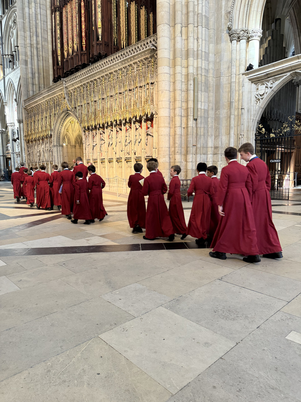临近约克大教堂关门的时候,突然看到穿着红衣的神职人员带领一群穿着教会服饰的大大小小的孩子们在管风琴处集合,原来他们在为第二天的活动排练。游客们都静静地站在那里,置身于教堂之中,聆听红衣唱诗管风琴悠扬,感受着英国古建筑的恢宏,空灵圣洁。