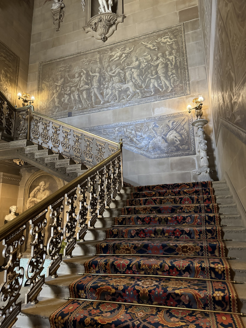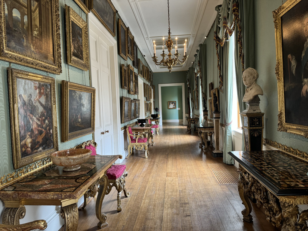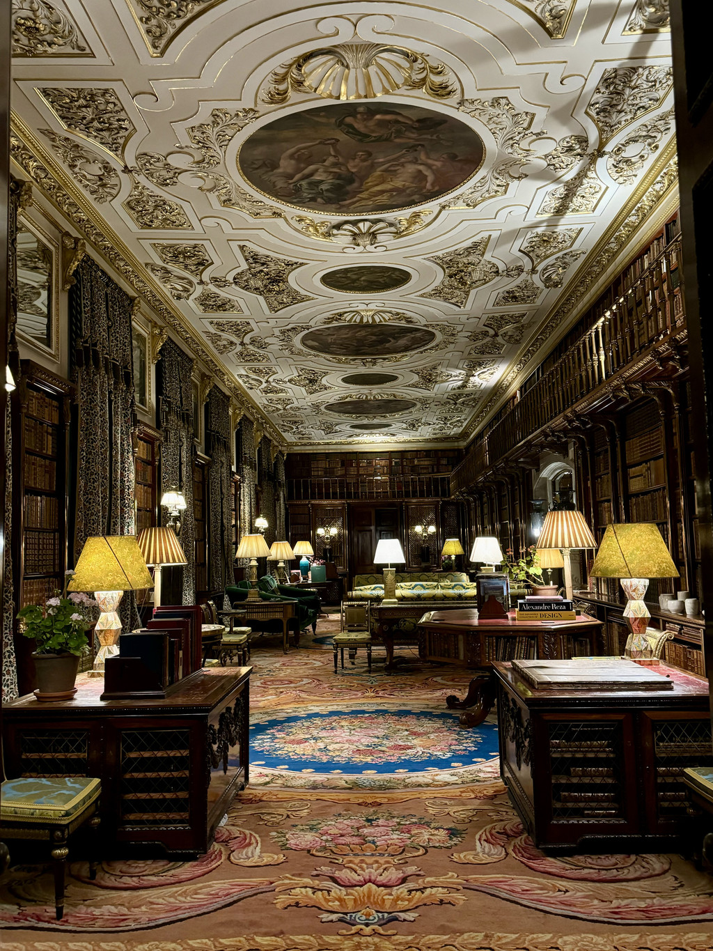 大厅、墙壁和天花板上大幅的画作装饰搭配大厅内的各项艺术品,处处透露着英国贵族的讲究与奢华。房子的每一个角落都让人感受到富贵、精细、打理的用心。金碧辉煌的壁画,鎏金的阶梯和围栏,象牙白的浮雕,造型繁复的壁灯,在暖黄色的灯光下分外炫目。庄园里陈列了许许多多的家族藏品,有法国、意大利画家的名画,中国的瓷器,满屋的藏书……