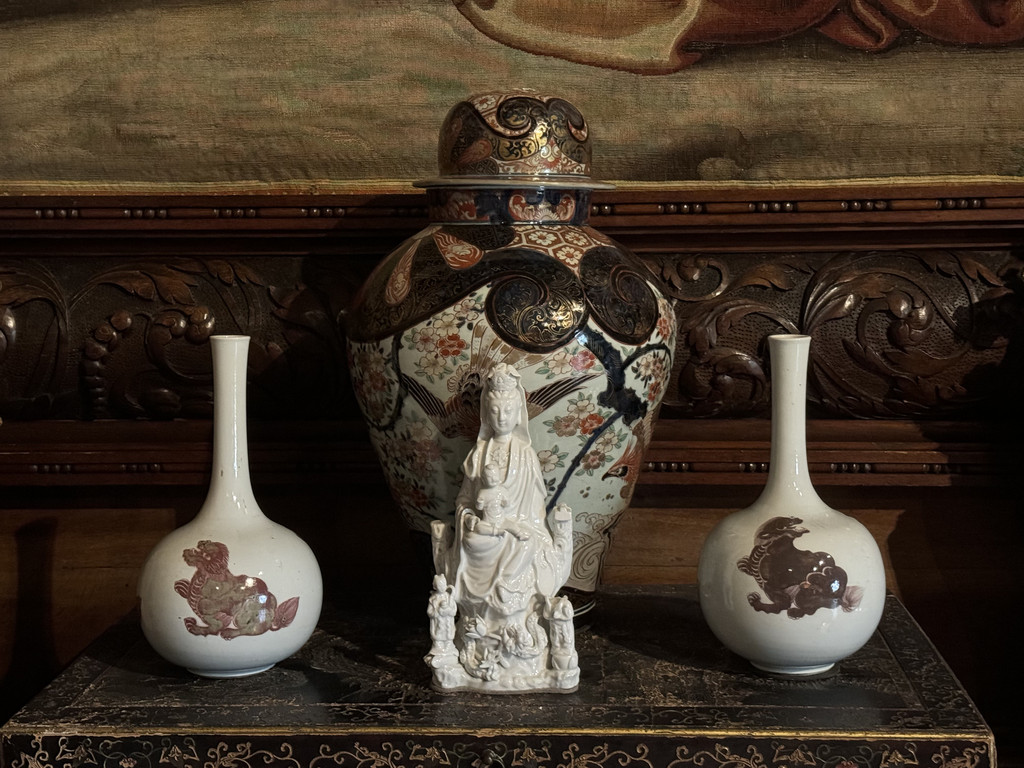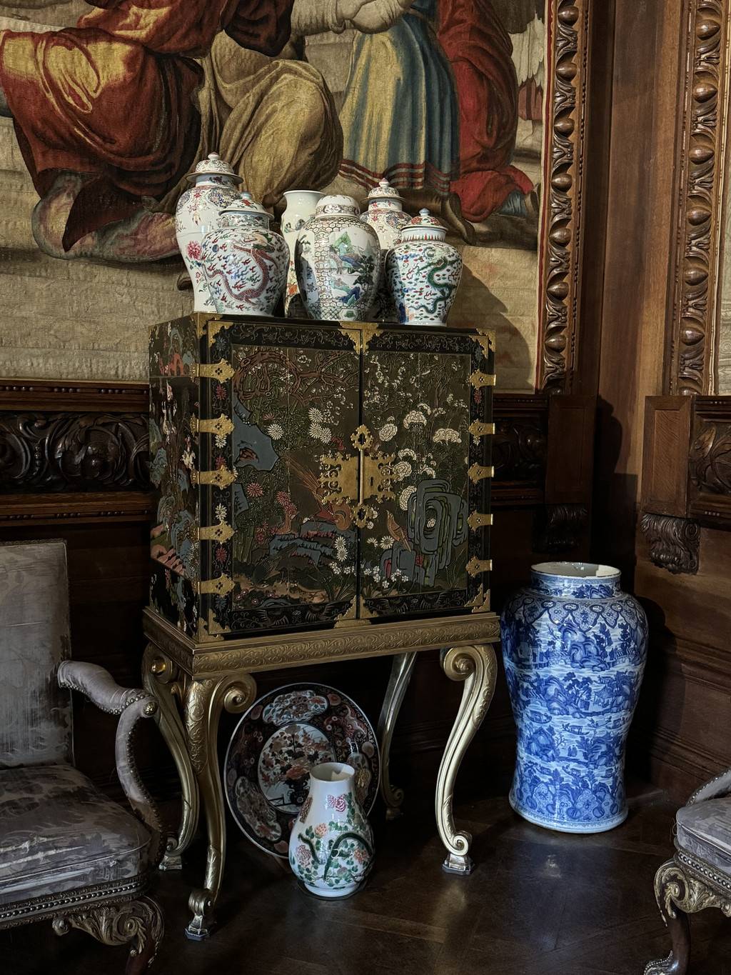 庄园有很多东方元素,足见当时中国风在欧洲的风靡。除了中国风的壁纸,瓷器馆和各个房间里也散落着精美的东方瓷器,中国的瓷器与西方油画、壁画相得益彰,再加上些典雅的花束盛开其间,雅到了极致。