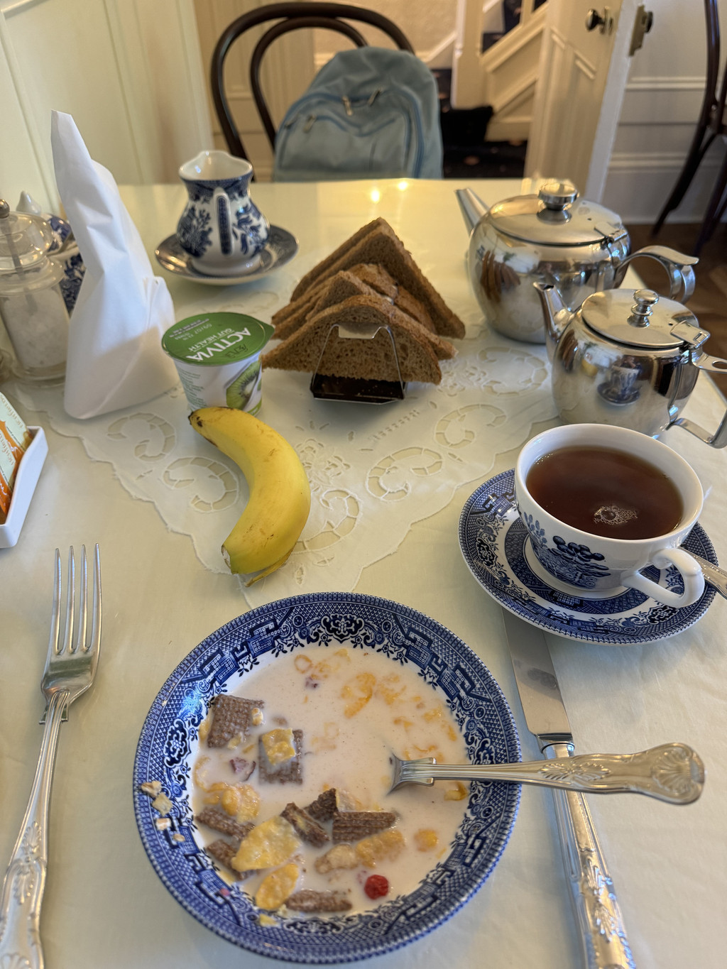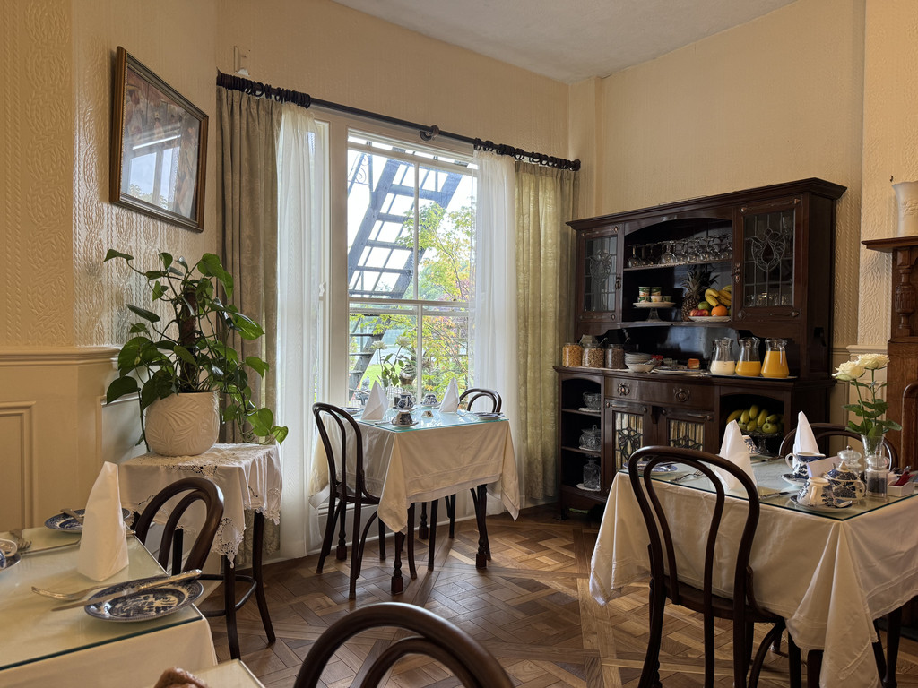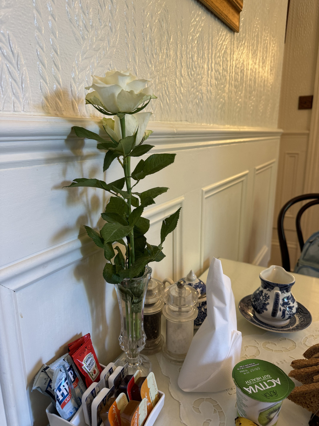 梧桐宾馆提供丰富美味的早餐。主人特别喜欢白玫瑰,每天都看到盛开的无一丝凋敝之色的白玫瑰摆放在餐厅和大堂。今天要去杜伦day trip,所以提前选了相对简单的自助早餐,准备在第二天早餐再享用全套英式早餐。