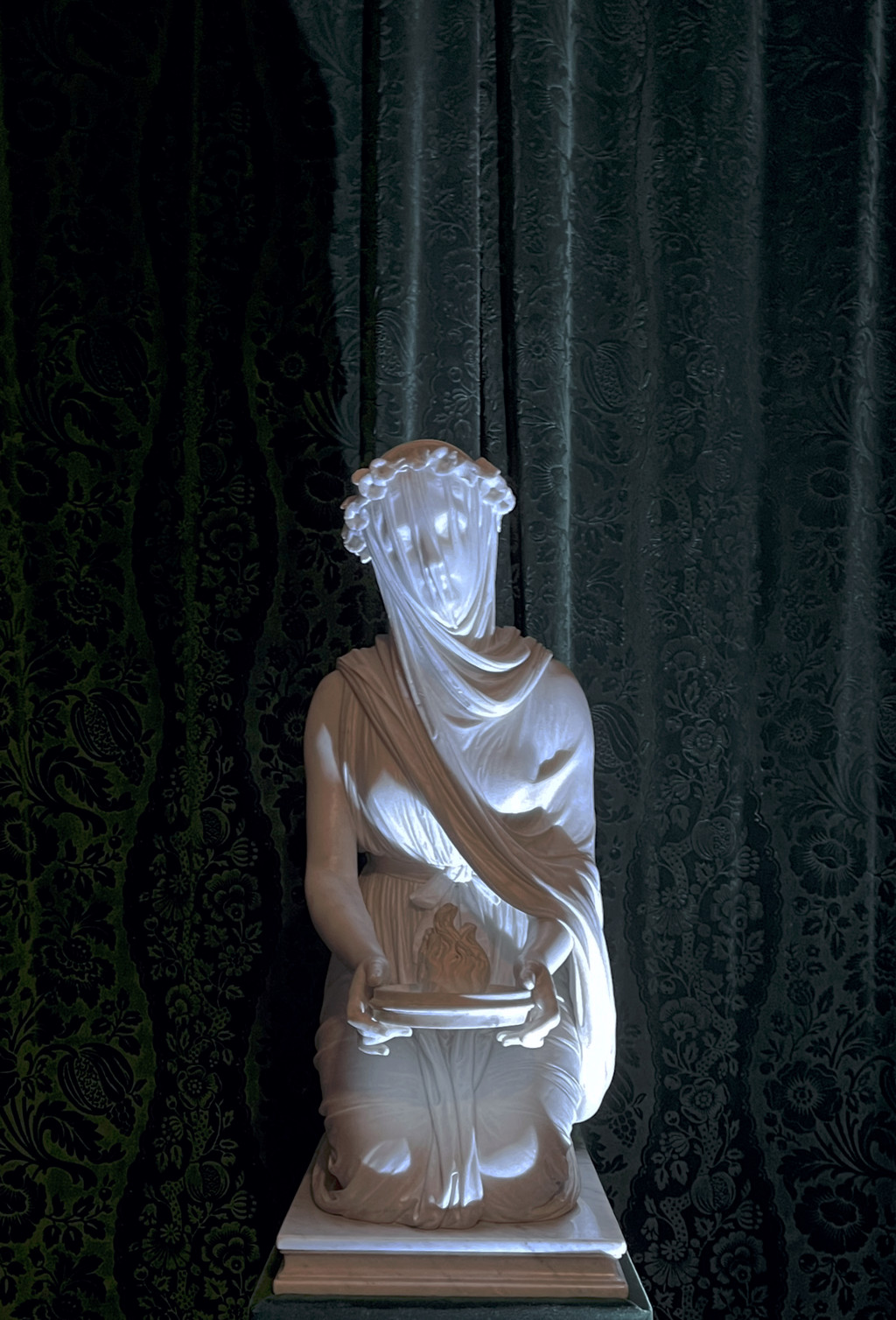 查茨沃斯收藏了很多珍贵的雕塑,大多都是雕塑爱好者六世公爵购得的,其中最有名的是来自意大利雕塑巨匠拉菲罗•蒙蒂(Raffaelle Monti)的著名作品——蒙着面纱的修女(Veiled Vestal Virgin),薄如蝉翼的面纱褶皱极为逼真,少女栩栩如生。这也是电影里的实拍场景。