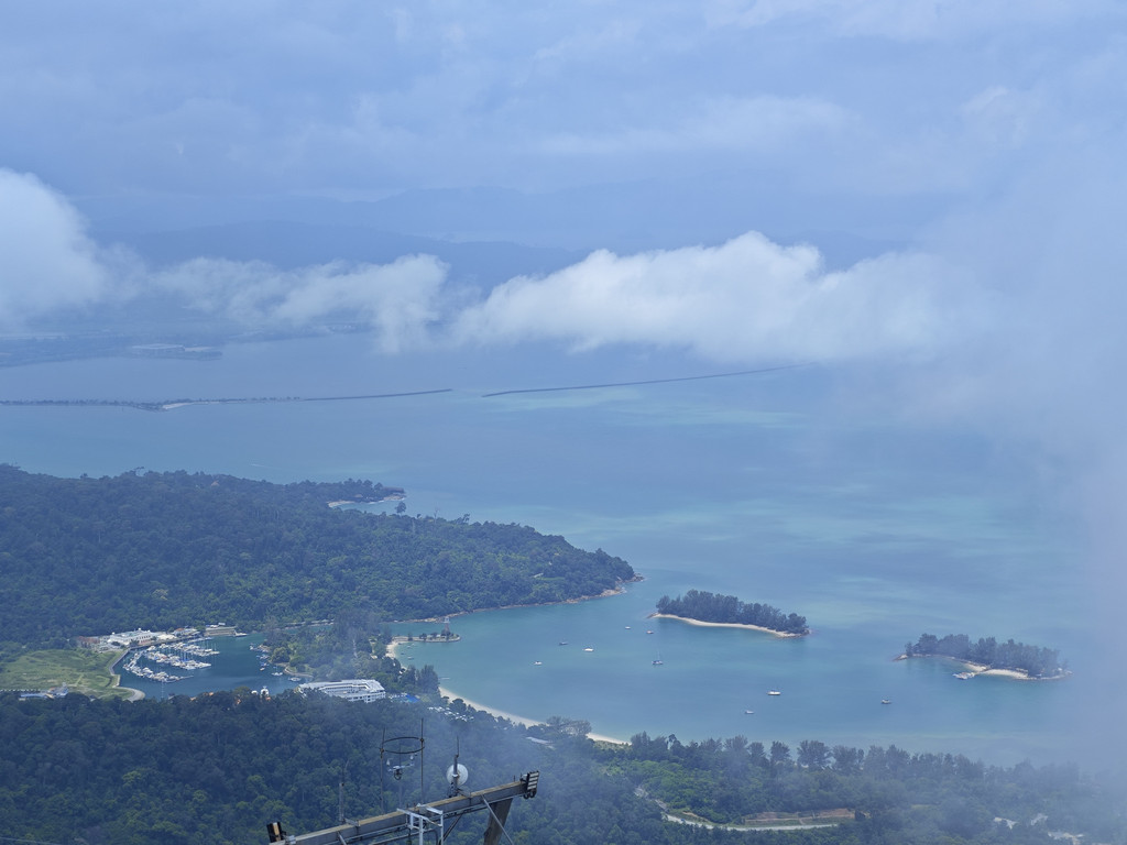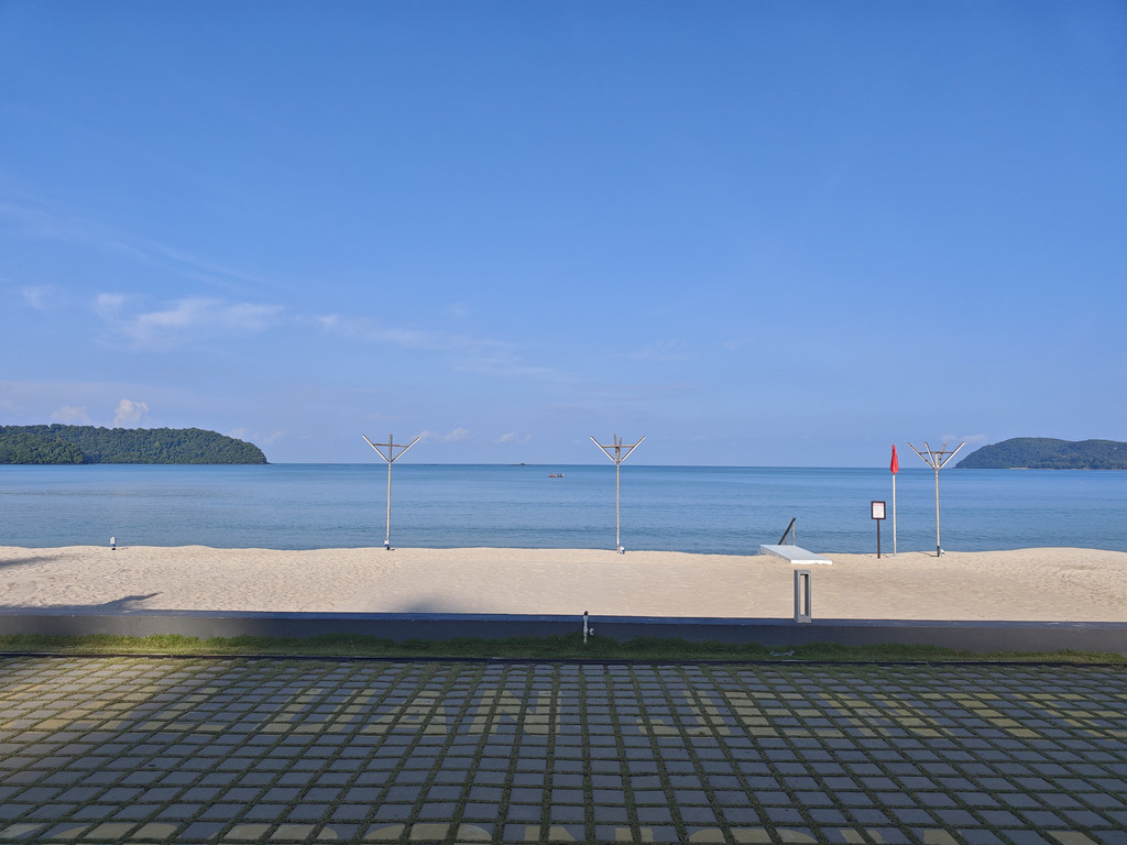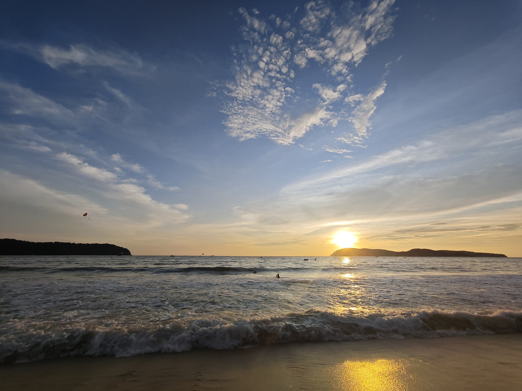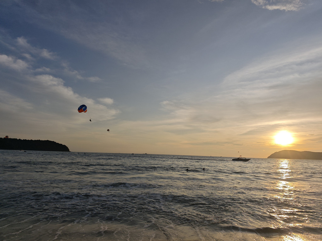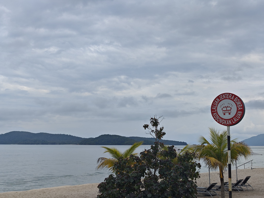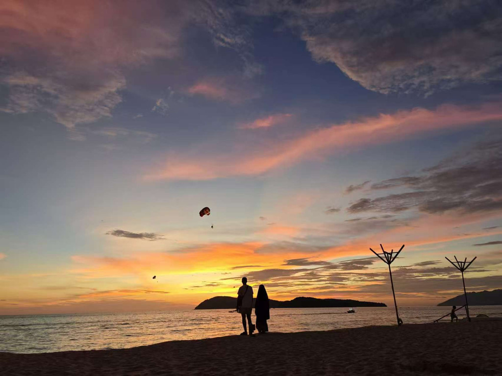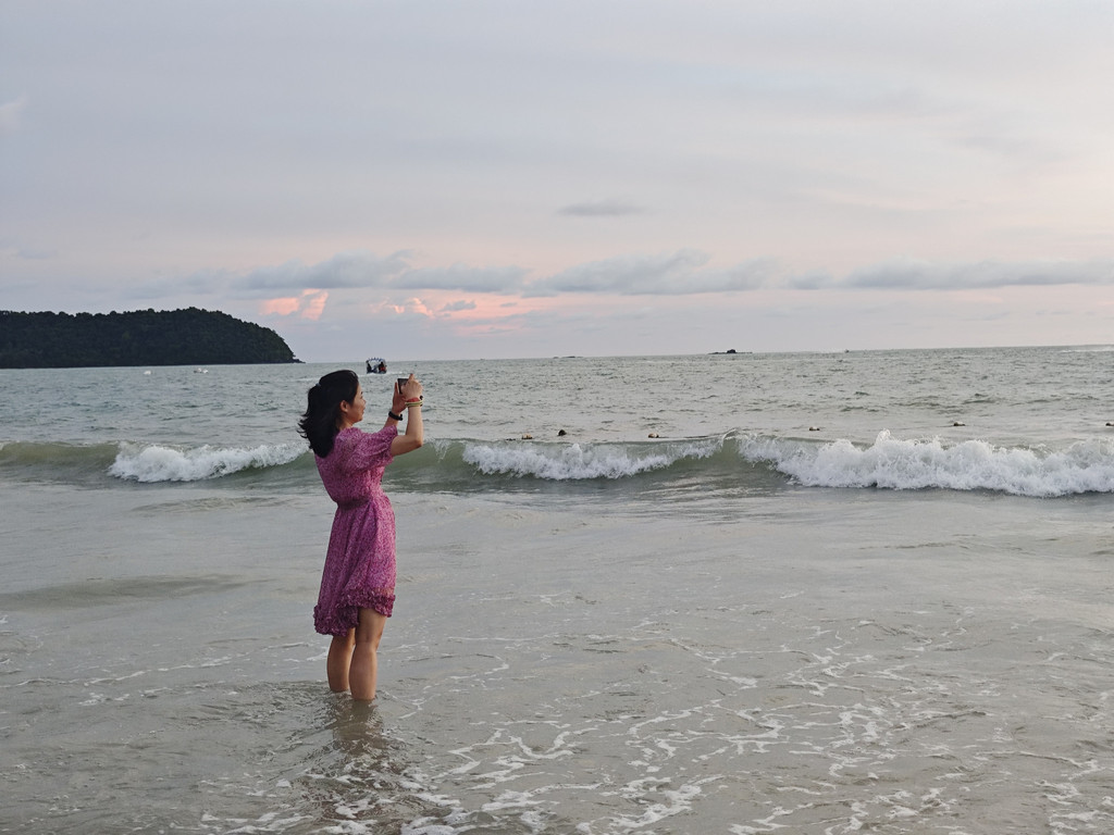 看看大炮看看海,因为较热,看了一会儿后回酒店理行李了。鉴于等下是亚航,在理完行李后,到前台称了每一个行李的重量,寄存到了13点。期间到酒店对面的小店(好像叫街角咖啡店)草草吃了个午饭,总体口味偏淡。我们的送机包车在13点准时来接我们了。到了槟城机场,进入后的右手边就能找到亚航的自助机和自助托运的地方。有亚航的工作人员在自助机旁帮忙进行自助托运。槟城的机场官方英语口音真的挺重的,很难听清,一定要竖起耳朵听目的地的英语,或者一定要时刻关注飞常准这样的小程序。对于大马国内飞的亚航行程,没有对随身行李进行称重。除了有口音的英语,还要关注好自己的座位号是属于哪一个ZONE。进入登记后的地方,真正登记时会喊你所属的ZONE来安排先后上飞机。槟城到兰卡威很近,全程40分钟就到了。在飞机上可以看到下面蔚蓝的海,很漂亮,全客舱的外国人都在忍不住拍照。兰卡威的机场真的挺小的,没有廊桥,只有1层。出站非常迅速,很快我们就与接应我们的包车小姐姐碰头了。我们定的包车是写了华语司机,可能今天么有华语司机了,所以来了个非华语司机+华语小姐姐一起来。华语小姐姐讲话很客气。从兰卡威机场到兰卡威宾乐雅开车15分钟就到了。小姐姐在前台帮我们全程充当了翻译,前台都是马来小伙子,不会中文。兰卡威宾乐雅酒店是需要付押金的,3晚4间一共押金1200马币,我们由于没有足够的现金了,就刷了visa的预授权,后来这个预授权是离店之后的30天后解冻的(CHECK IN的时候说是离店后15个工作日左右),也收了非常标准的旅游税(每成人每晚10马币)。办理好入住后,我们休息了一下,到酒店后面的比较网红的中华海鲜楼吃了晚饭。这里在点评网上都是比较多提及的,是华人开的海鲜馆。有炒菜。但是,很惊奇啊,这里的海鲜是冷冻的,并不是我们以为的生鲜的呢!总体来说,味道还行,性价比一般,想吃中国菜口味的可以来。吃完后,我们一路步行,大约10分钟不到吧,走到了著名的珍南海滩。沙滩上也有一些非常有氛围的适合打卡的餐厅,脚能踩着沙滩的那种,但考虑到是西餐,所以我们没有尝试。天色渐渐暗下来,珍南沙滩逐渐呈现出它的美丽,远处的云层变成粉色,身边只有不断地感叹美丽和相机快门的声音!