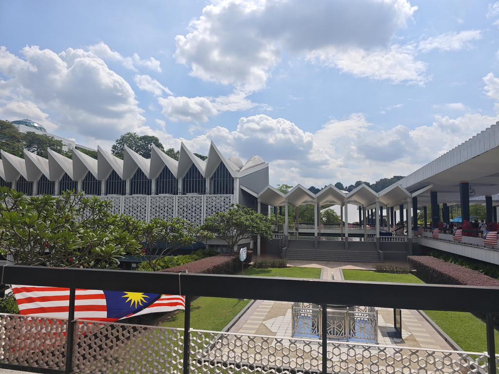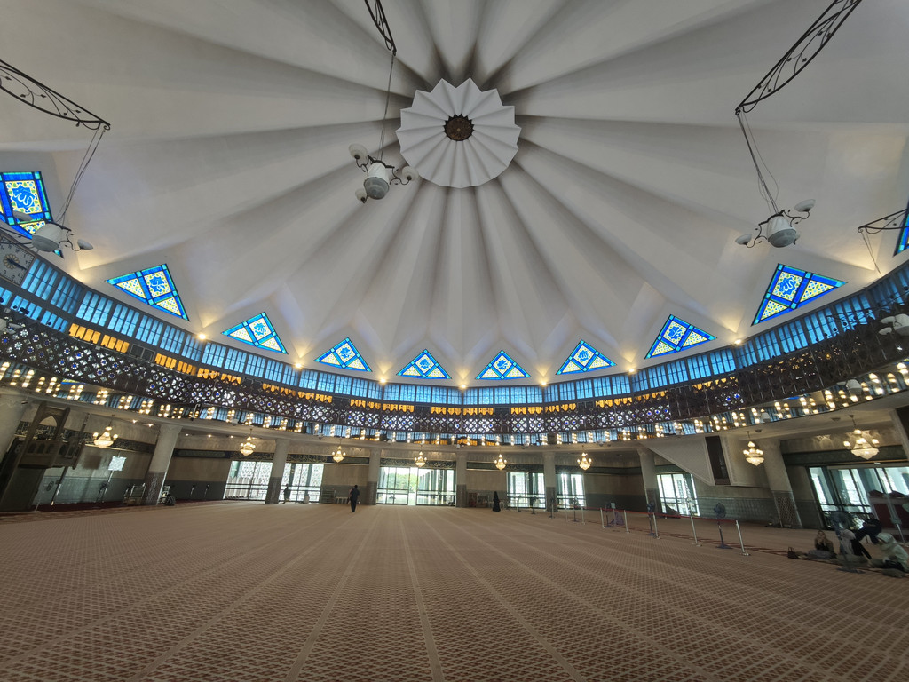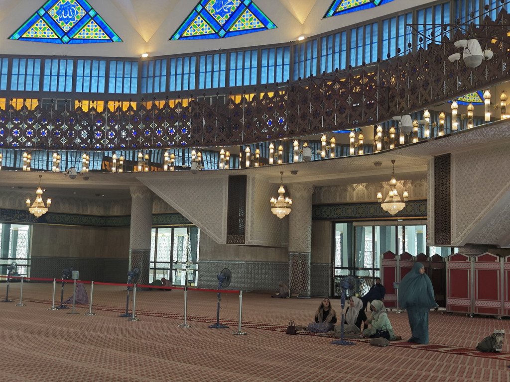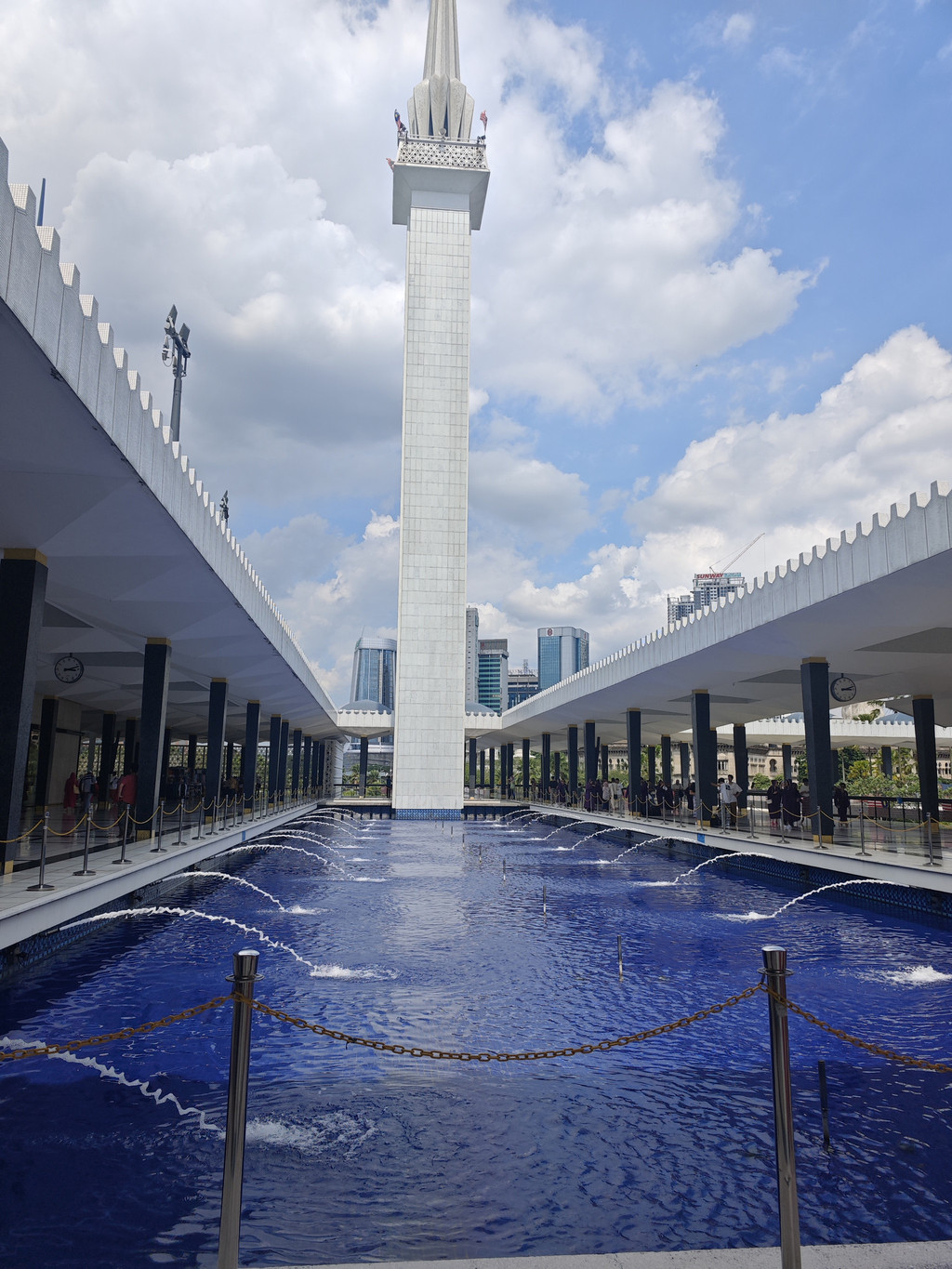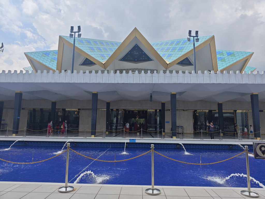 今天离开兰卡威了,吃了早饭后,9点30分,收拾好行李司机来接我们去了机场。CHECK OUT前台小伙子有再次核对我们的旅游税是否支付和押金,告诉我们押金在15个工作日会返还。兰卡威机场也非常小,考虑到机上无餐食,我们其中几个人在送达后安检前买了汉堡王带在包里。兰卡威的机场里免费饮用水不多,当我儿子灌满了1升他的大水杯后,它的直饮水机器竟然没水了,机场工作人员告诉我们接下来从0开始净化,大约30分钟后才能再出水了。在安检进来后候机处,也有个汉堡王的摊位可以点餐,但这里有几块钱的点餐费,原因就是点完后他得从之前那个我们买过汉堡的店里送过来,在这里多出来的几块钱等于就是短途配送费吧。这里的亚航进安检时看到随身包较多的会让放下来称重,我们一般就手提1件或者1个背包的就直接让我们进了,不用特意称重。飞机准备起飞,在机上把包里的汉堡吃了当午餐。下午13点10分准时到达吉隆坡。吉隆坡国际机场到底大多了,出机场走了些时间的。等了司机几分钟的,接上我们后直接去了国家清真寺。今天是周五,下午15点开始参观。我们到的时候大概还有10分钟,就开始排队。在排队时有一个码需要扫码登记一下,一行人中可以1人登记,写好同行几人即可。脱好鞋,换上他们的袍子就可以参观了。这个清真寺会在每个适合拍照的地方有标记,手把手告诉你应该在哪里打卡。