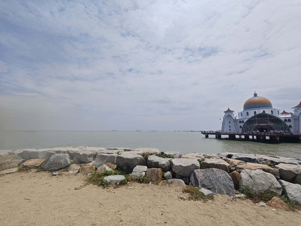 但司机再带我们去了它的背面,这里有湖面,倒映出来的粉红清真寺更加美丽,拍照也更有意境。吉隆坡市区到布城不远的,从布城到马六甲的距离较长。一路高速,中间还进了一次服务区,在这里买了个榴莲味的冰激凌。快到马六甲主要区域时,我们先去吃了林记肉骨茶,是华人开的店,味道不错。吃饱喝足,先去了这里的一个水上清真寺,这里望出去就是马六甲海峡了,因为是水平位置看,所以感觉不是特别震撼。