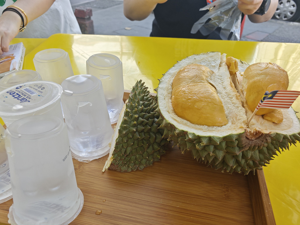 今天大概是半天的时间可以游玩,也没有安排特别的比较远的地方。就到槟城的旧关仔角附近打个卡吧。由于大叔榴莲摊的性价比较高,我们决定再次光顾大叔的榴莲摊。好像是9点半开摊,我们掐着点去照顾大叔生意去了。吃完后支付宝境外小程序打车去了旧关仔角附近逛了一下。