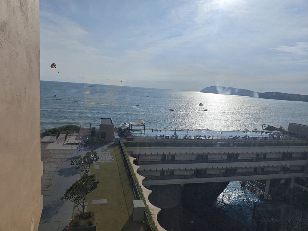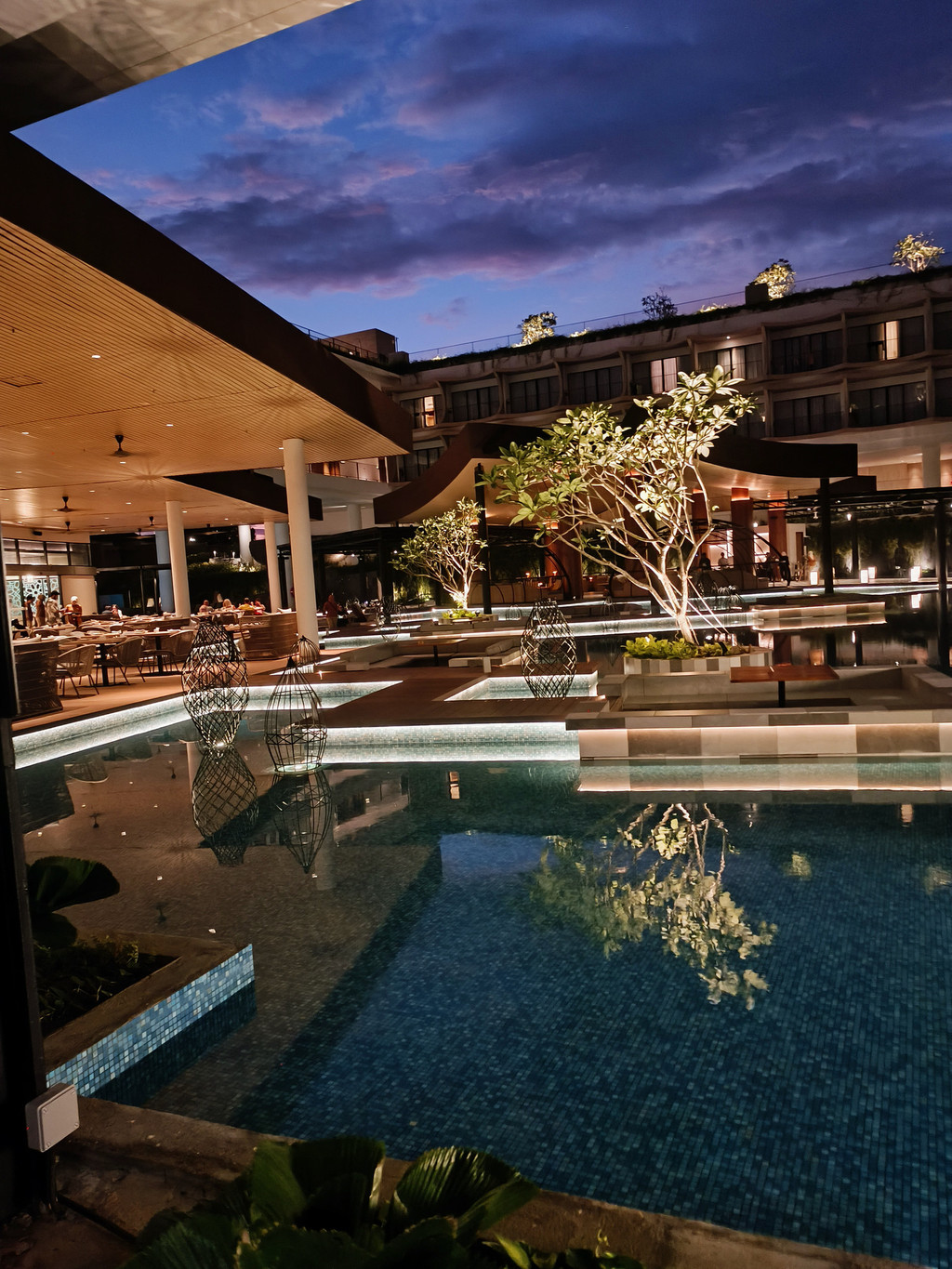 一楼的泳池是专门给带小孩的游玩的,有暴晒的地方,也用利用酒店廊道遮阴的区域。到了特别的时间,酒店的工作人员还拿出水球和网配合大家在岸上捡球。5楼的无边泳池拍照好看,但是这个泳池水深一点,小孩被禁止进入。到了晚上自行吃了晚饭后又到沙滩上来了。