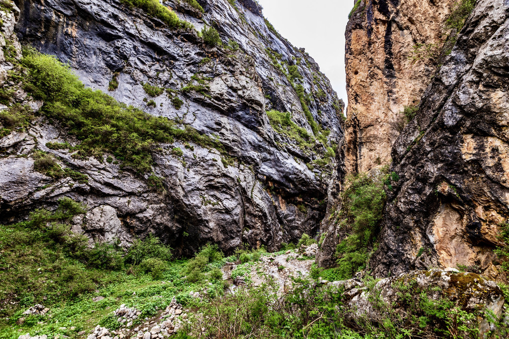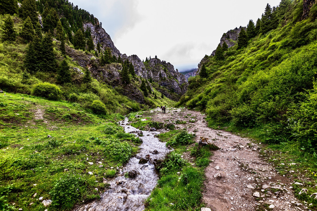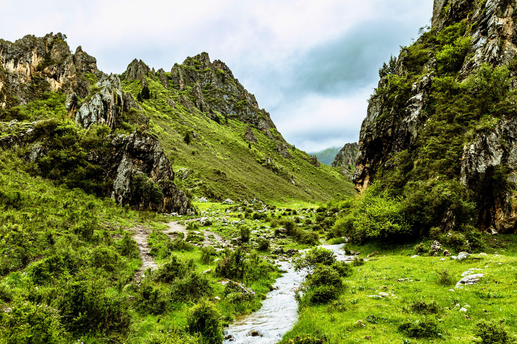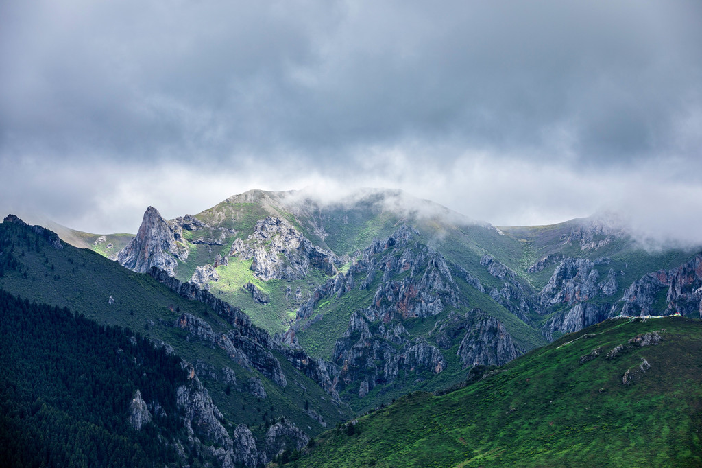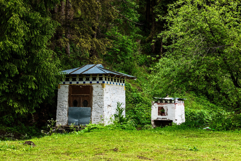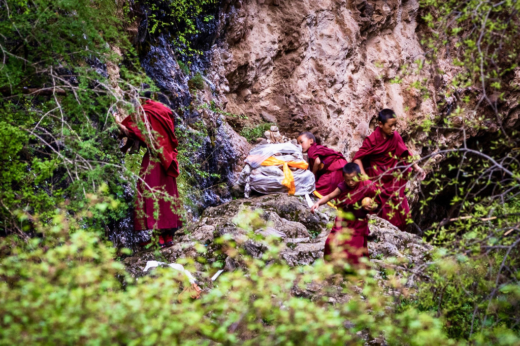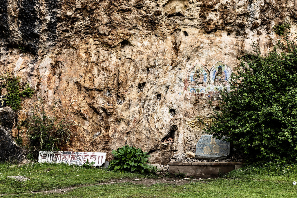 早晨7点多仍然乌云密布。昨天夕阳失望,今天日出落空。睡个回笼觉后9点多起床,酒店后山雨后一片青翠,虽令人心旷神怡,但看来今天不会有太好的天气。从酒店开下山坡,右转就到格尔底寺大门,买完30元门票后可以直接开车到肉身宝殿前的广场停车。我们找了一位藏族小伙子当导游,溯白龙江而上去纳摩峡谷,这条路两边高山,道路狭窄,偶尔需踩着江水中的岩石前进,甚至淌水而过,女朋友还掉到水里几次。我的防水户外鞋在这里充分发挥了作用。