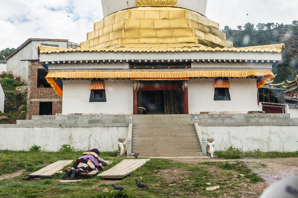 网上资料说郎木寺有辩经,下午1~3点、5~7点各一场,但没说清楚具体位置,我们不确定是格尔底寺还是赛赤寺。问了两个喇嘛,都指着赛赤寺的方向,用蹩脚的汉语说「在山上那个金顶的大殿前面」。我不放心,在停车场前看到一位年轻的喇嘛,请问他「辩经的地方在哪里?」他没听懂「辩经」是什么意思。我灵机一动做了个辩经中击掌的手势,他终于恍然大悟,还是指着赛赤寺的方向说是山上那个金顶大殿前面。我问他:「是江对面,还是江这边?」这次终于确认了:「是江这边。我们这边是四川,江那边是甘肃。是在我们四川这边。」远在天边,近在眼前,其实就是肉身佛殿旁小山坡上去不远的一座金顶佛殿。这时才12点,我们决定就在佛殿前的广场等着,以免遗漏什么而造成遗憾——我们太想看到辩经了。