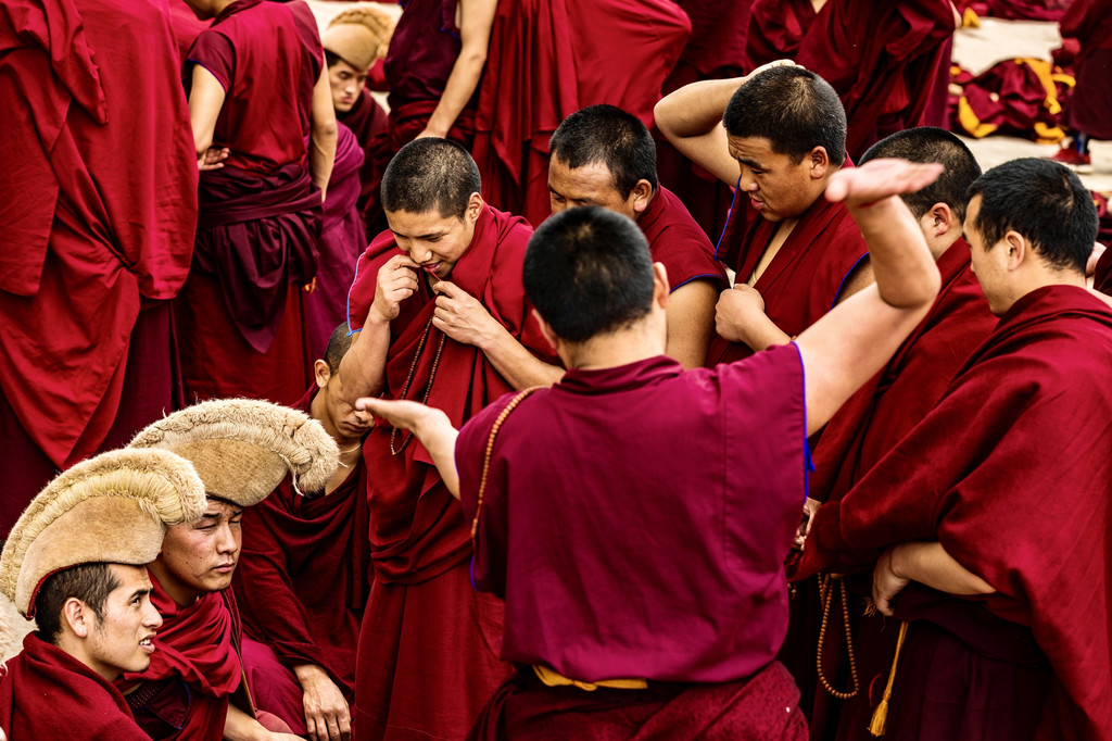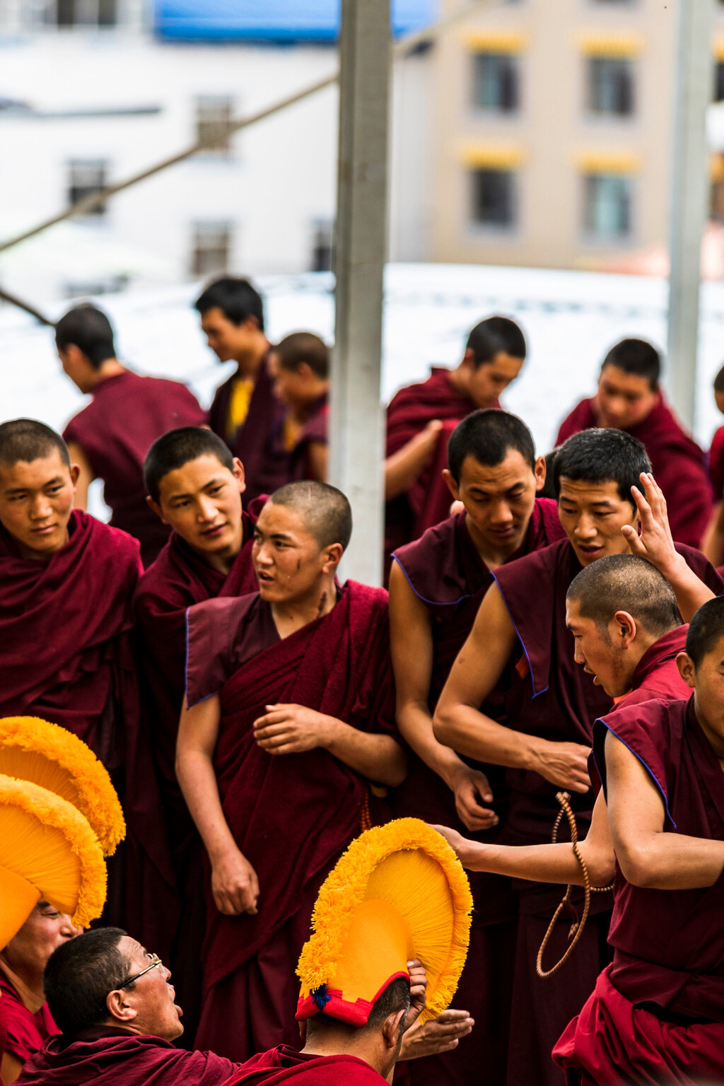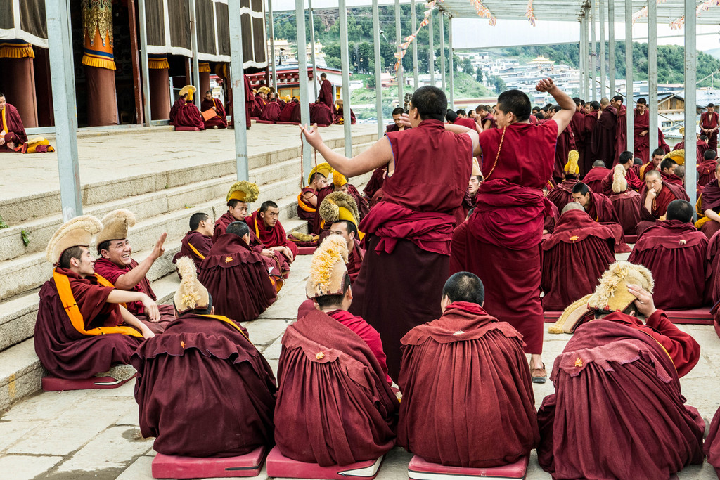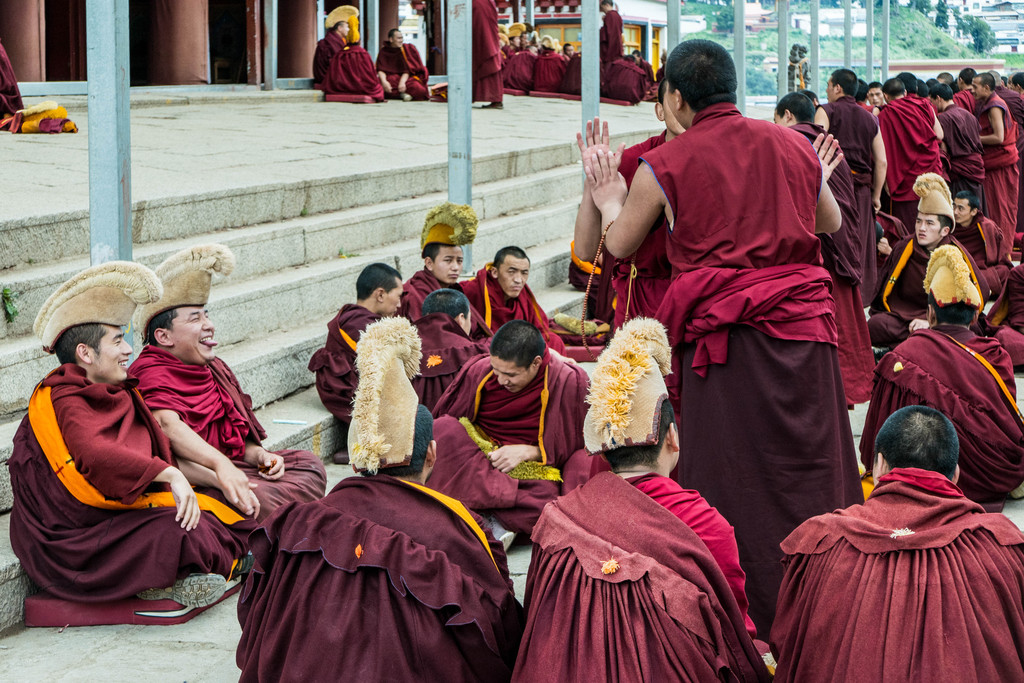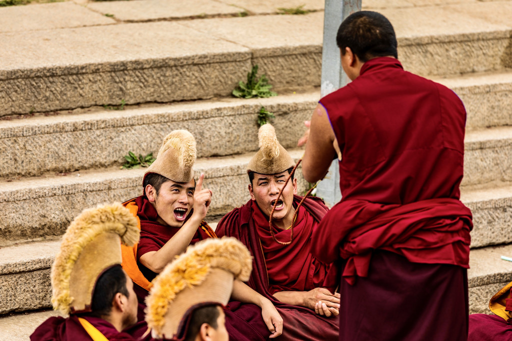 12点半开始,终于看到喇嘛们鱼贯而来,在广场集合。我们坐在旁边阶梯上等着,观众只有我们两人。1点钟准时,喇嘛们在广场上开始分组辩经,两位看起来是较高级别的喇嘛在四周转圈,似乎在监督。中间一组几位带着黄色帽子,看起来级别较高,前面围了几十个喇嘛激烈提问,远远的我都替他们感受到压力。平时喇嘛是不让拍照的,但辩经时好像随便我们怎么拍,也可以走上广场寻找最佳位置,但不能进入两位喇嘛所转的圈圈,以免影响辩经的进行。