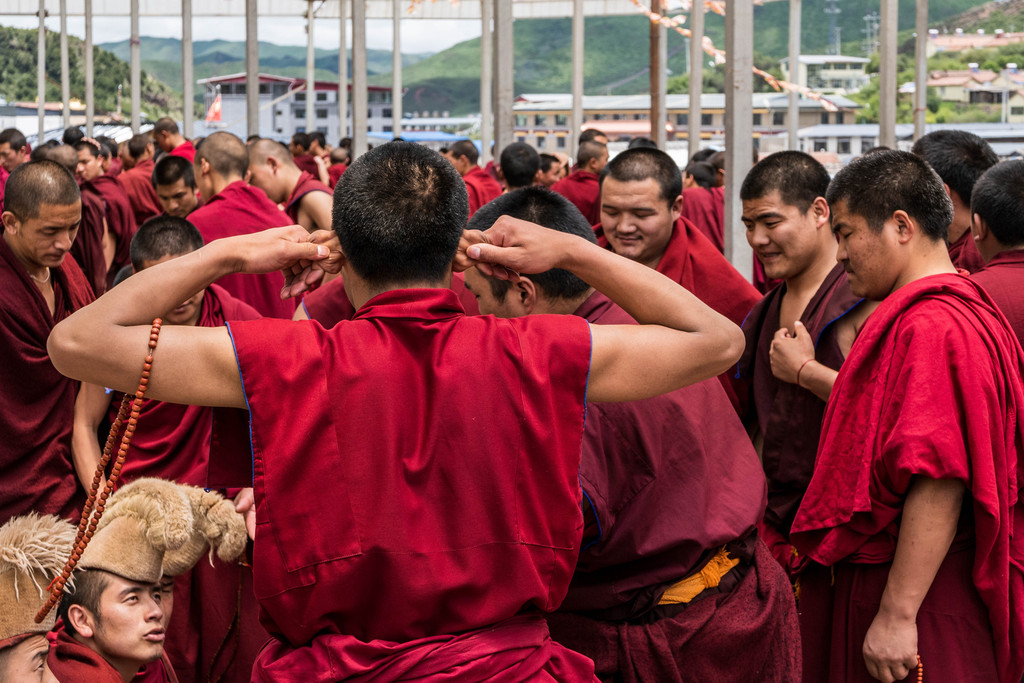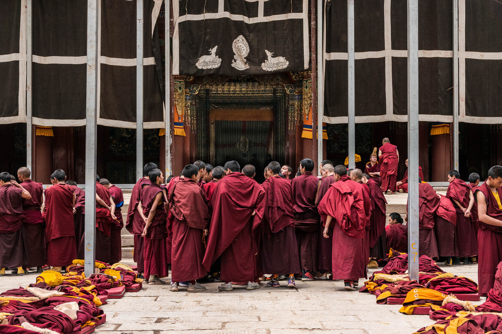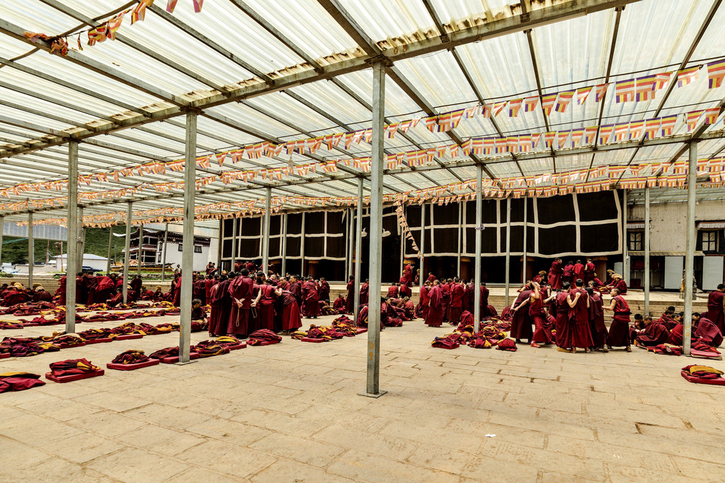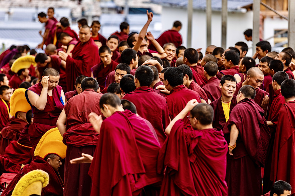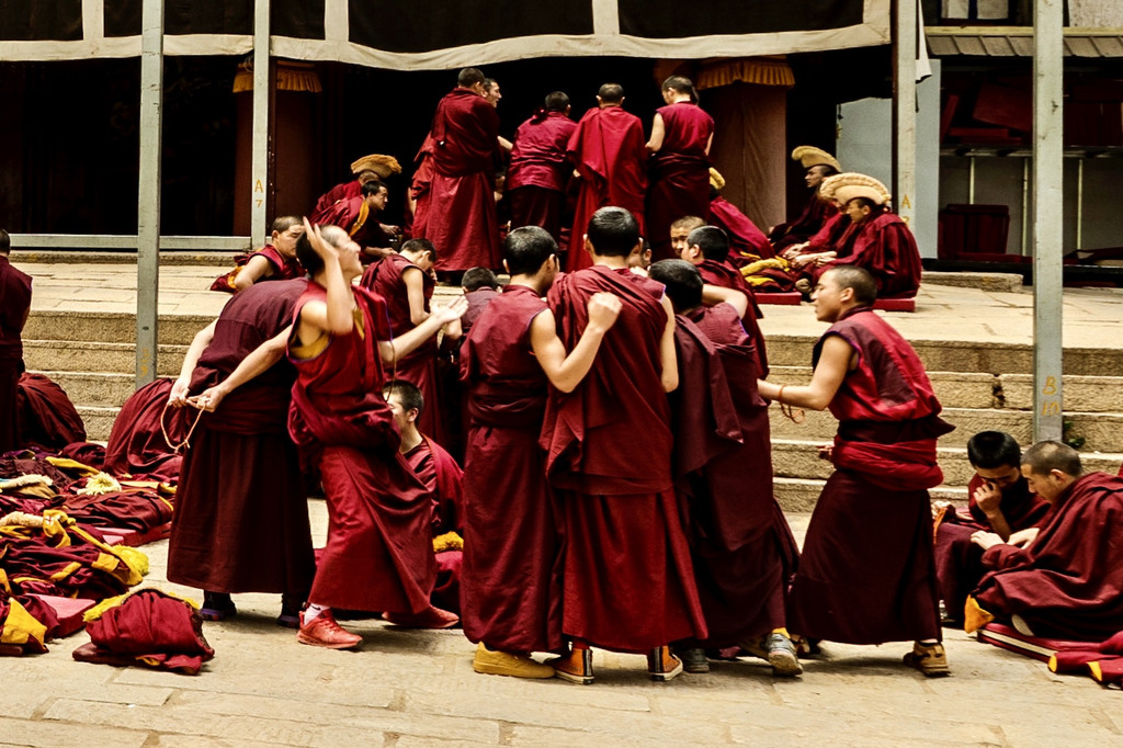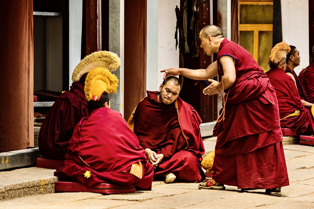 12点半开始,终于看到喇嘛们鱼贯而来,在广场集合。我们坐在旁边阶梯上等着,观众只有我们两人。1点钟准时,喇嘛们在广场上开始分组辩经,两位看起来是较高级别的喇嘛在四周转圈,似乎在监督。中间一组几位带着黄色帽子,看起来级别较高,前面围了几十个喇嘛激烈提问,远远的我都替他们感受到压力。平时喇嘛是不让拍照的,但辩经时好像随便我们怎么拍,也可以走上广场寻找最佳位置,但不能进入两位喇嘛所转的圈圈,以免影响辩经的进行。