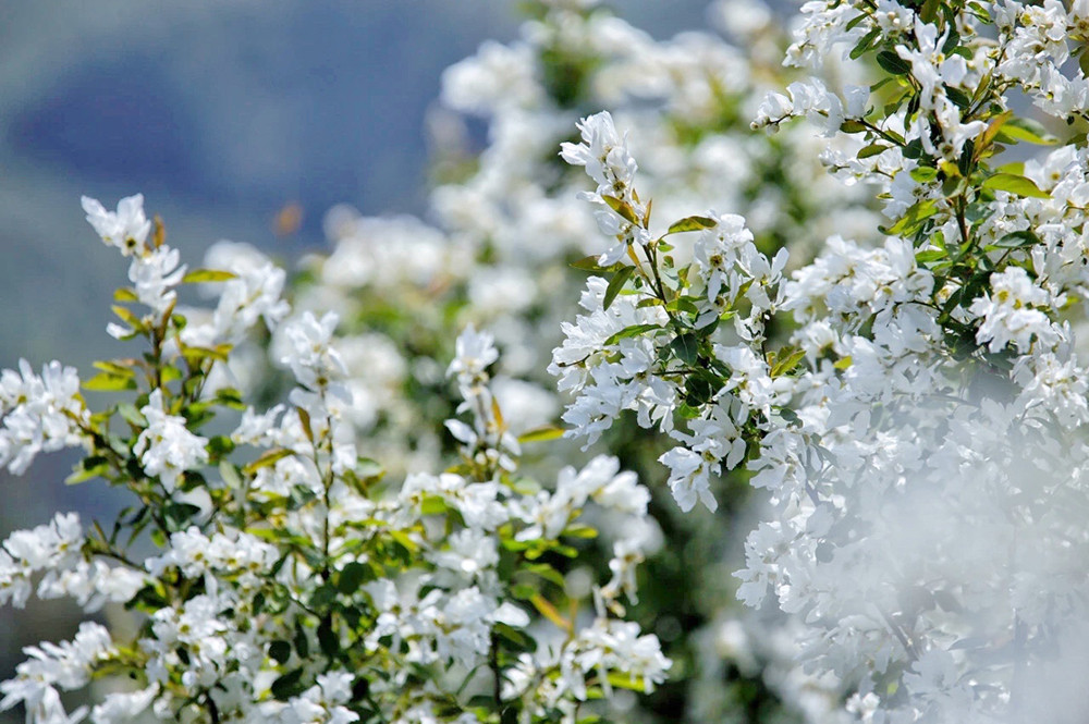 每年四月春深时,蓝田蓝关古道,虎头山上成片成片的白鹃梅绽放,白色的白鹃梅映衬着青色的山峦,非常的漂亮壮观。