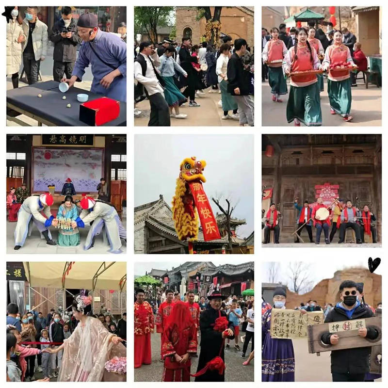 年画里的财神爷爷穿越而来,为到访的游客送上精美的礼品,祝愿大家新的一年财源滚滚;叫上亲朋好友一起来猜灯谜、跳大绳、滚铁环等趣味游戏,参与赢好礼!滋水县城里,百米迎亲队伍,八抬花轿、浩浩荡荡,场面喜庆又热闹;更有推媳妇大赛、蓝田鼓舞、绣球招亲、白鹿原人物秀等精彩演艺及趣味活动,赢得一声声叫好。