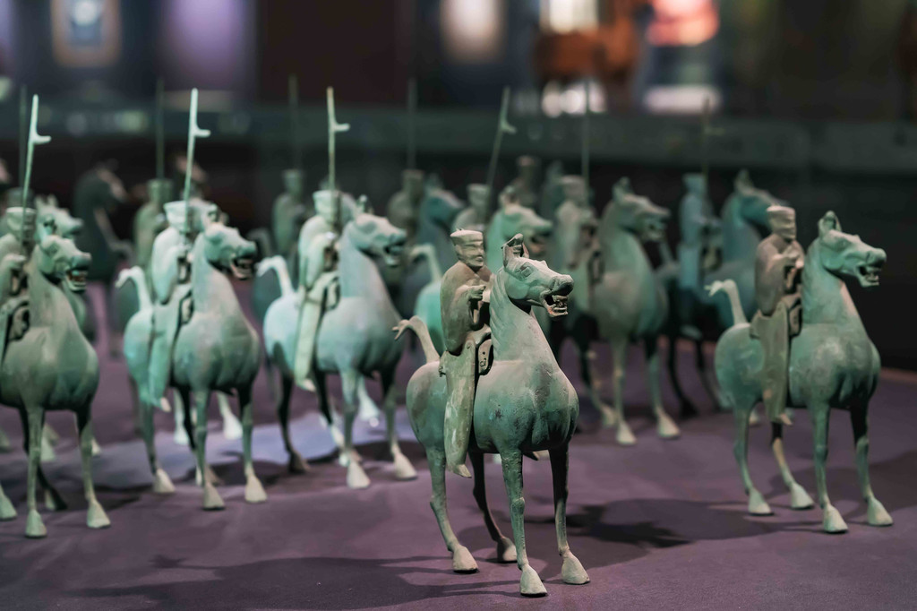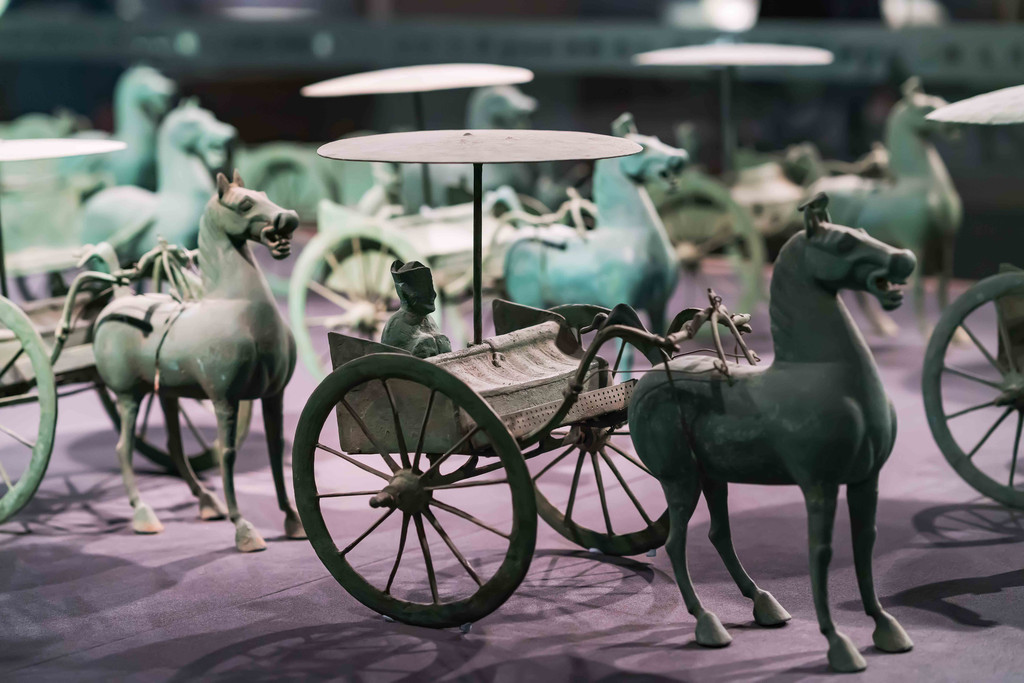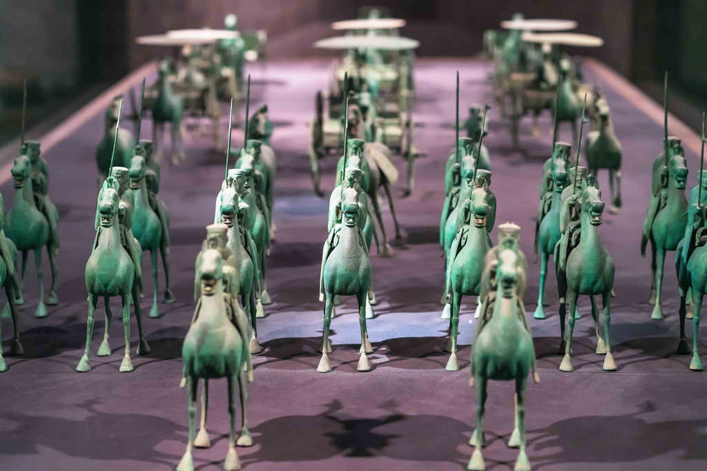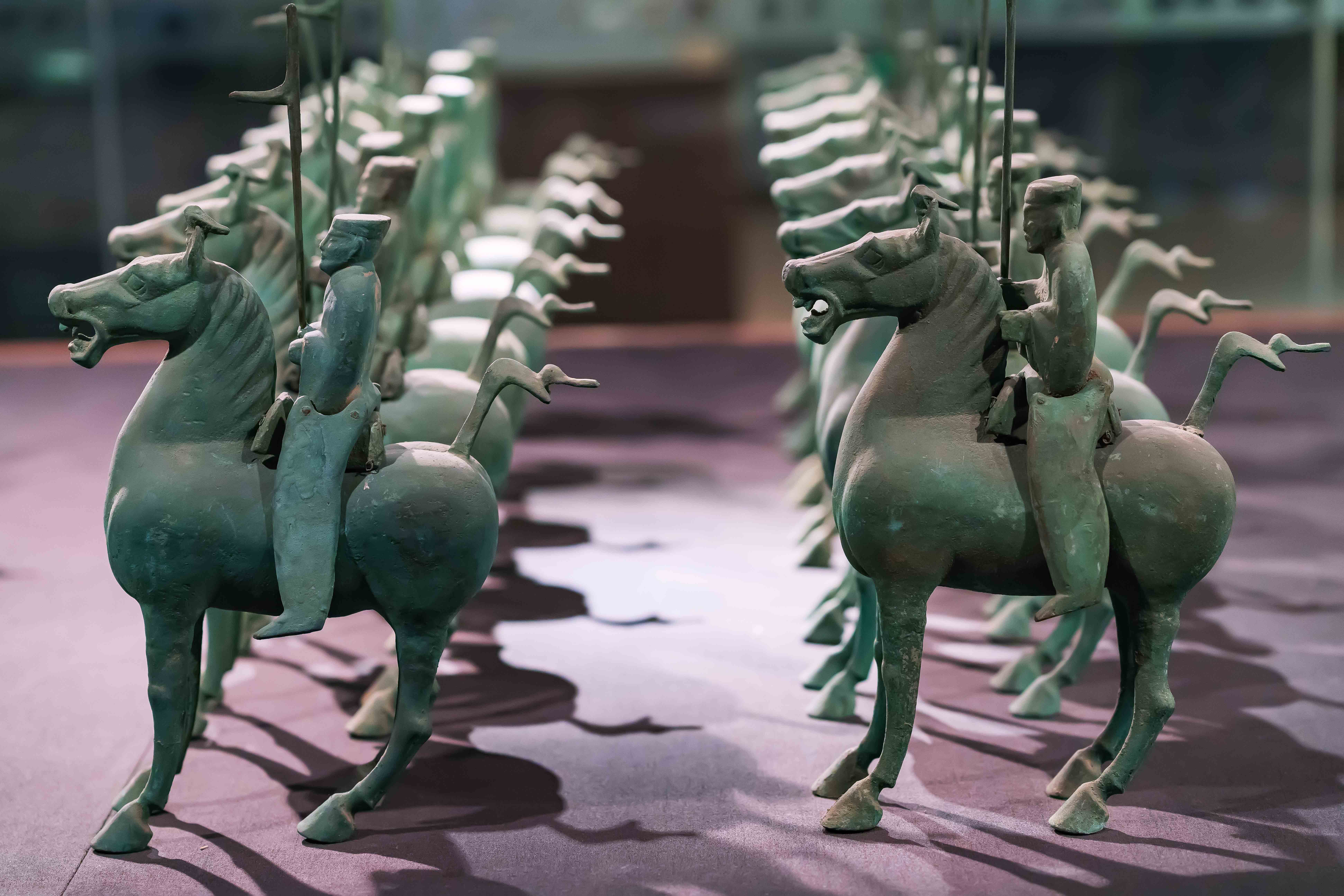 在甘博镇馆之宝铜奔马同处一个展厅的“铜车马仪仗队”,那场景除了精湛就是震撼! 铜车马仪仗队由38匹铜马、1头铜牛、1辆斧车、4辆轺车、3辆辇车、2辆小车,3辆大车、1辆牛车、17个手持矛戟的武士俑和28个奴婢俑组成——这是中国迄今为止发现数量最多的东汉车马仪仗铜俑,其气势宏大令人啧啧称奇。