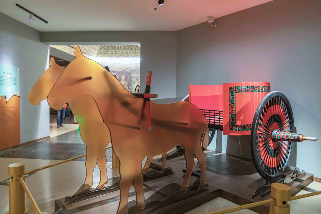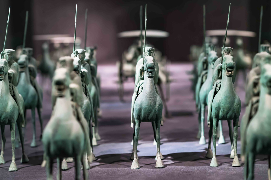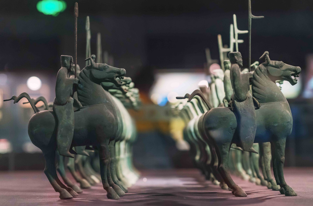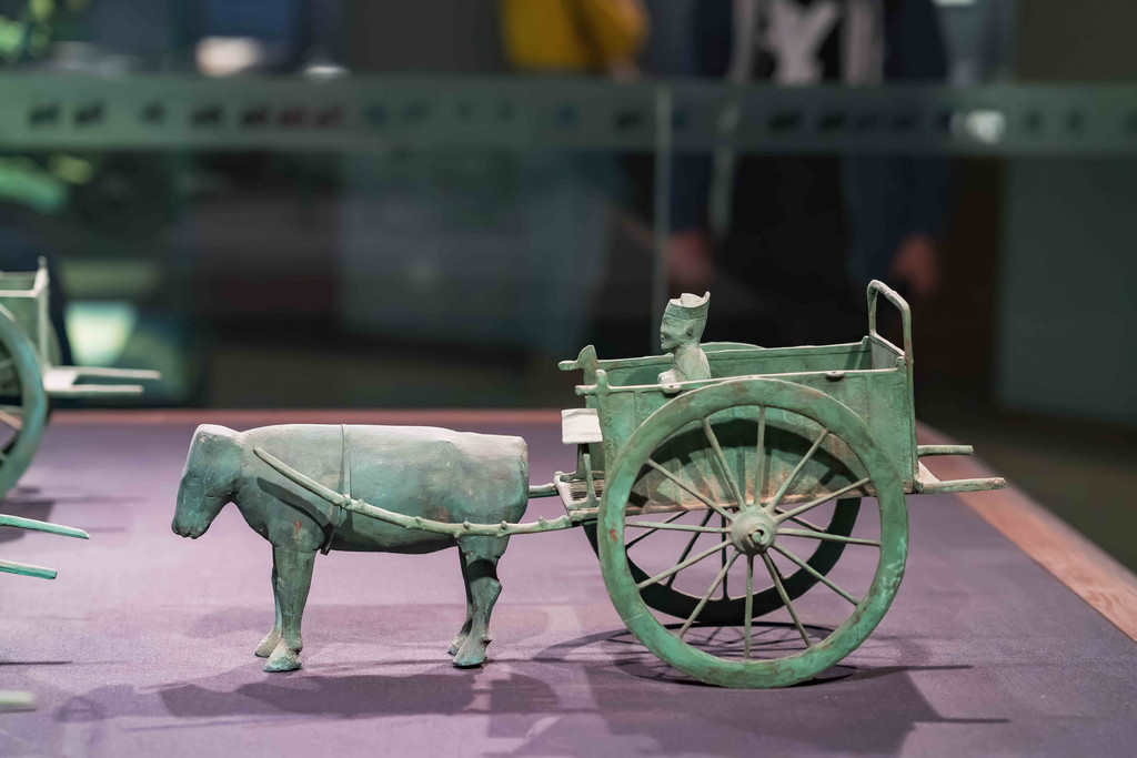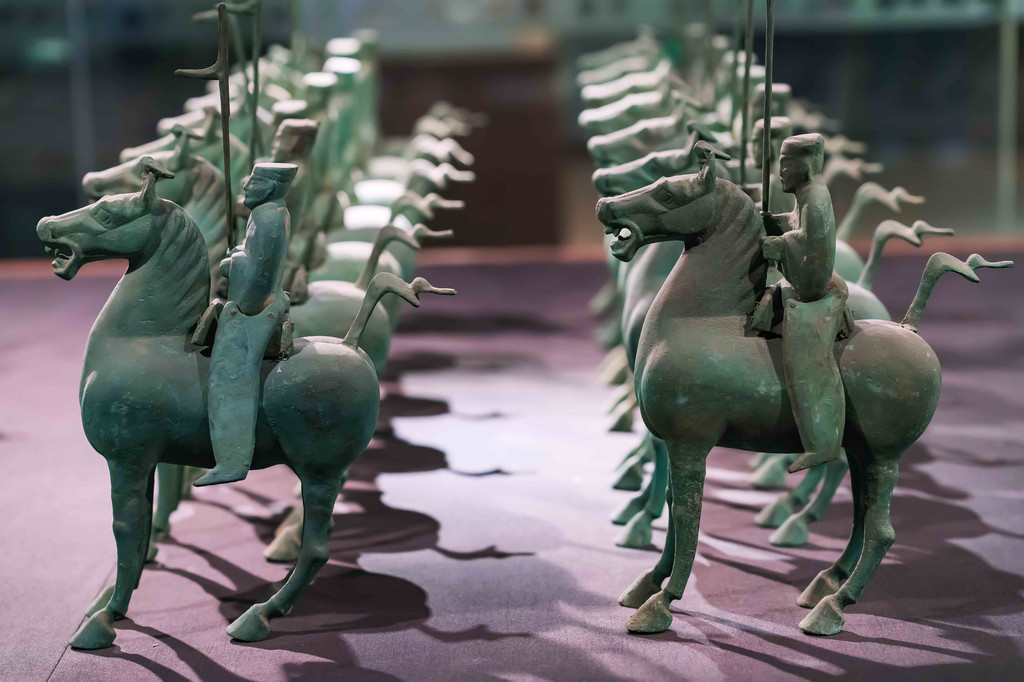 在甘博镇馆之宝铜奔马同处一个展厅的“铜车马仪仗队”,那场景除了精湛就是震撼! 铜车马仪仗队由38匹铜马、1头铜牛、1辆斧车、4辆轺车、3辆辇车、2辆小车,3辆大车、1辆牛车、17个手持矛戟的武士俑和28个奴婢俑组成——这是中国迄今为止发现数量最多的东汉车马仪仗铜俑,其气势宏大令人啧啧称奇。