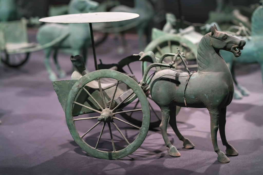 马是古代交通、军事、生产的重要工具。西域多产良马,为抵御匈奴骑兵进犯,汉武帝两次派兵西征,引进大宛汗血宝马,使汉代养马业和骑兵得到长足发展,铜奔马和铜车马仪仗队,就是这一历史发展之见证。