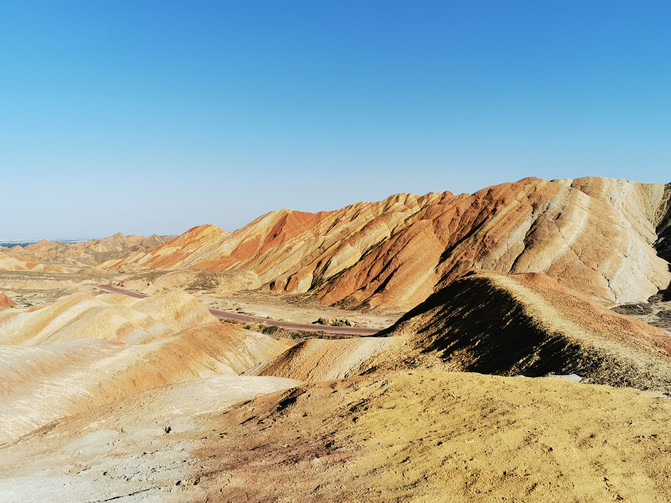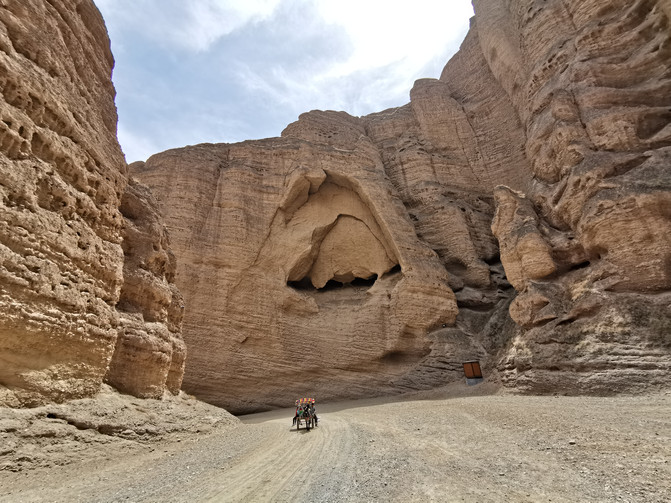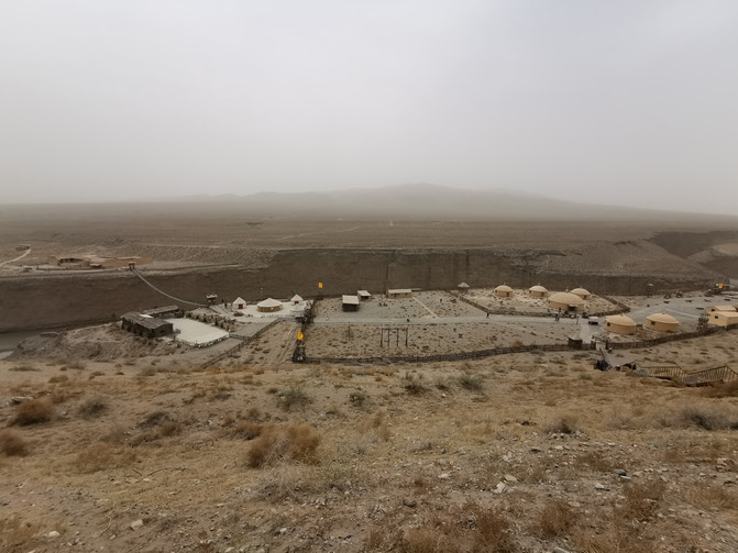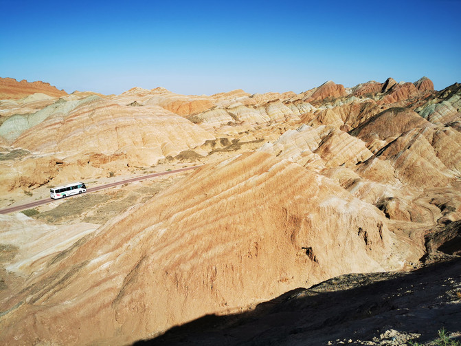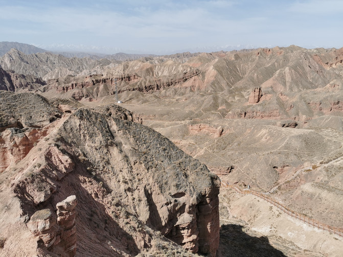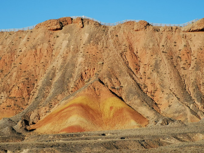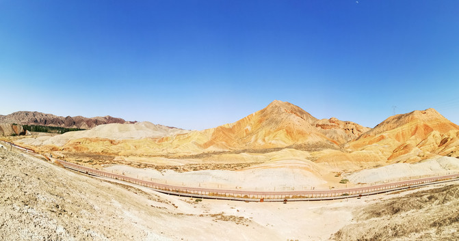 这一段比较考验体力,下车后要爬上一段高高的栈道方能望见锦绣山川,看落霞与孤鹜齐飞、望苍凉群山和曲折的公路,颇有狂野西部的味道。在山顶穿越一段长约900m的步道才能到达下一个大巴接驳点,在接驳点,有骆驼观光体验点。