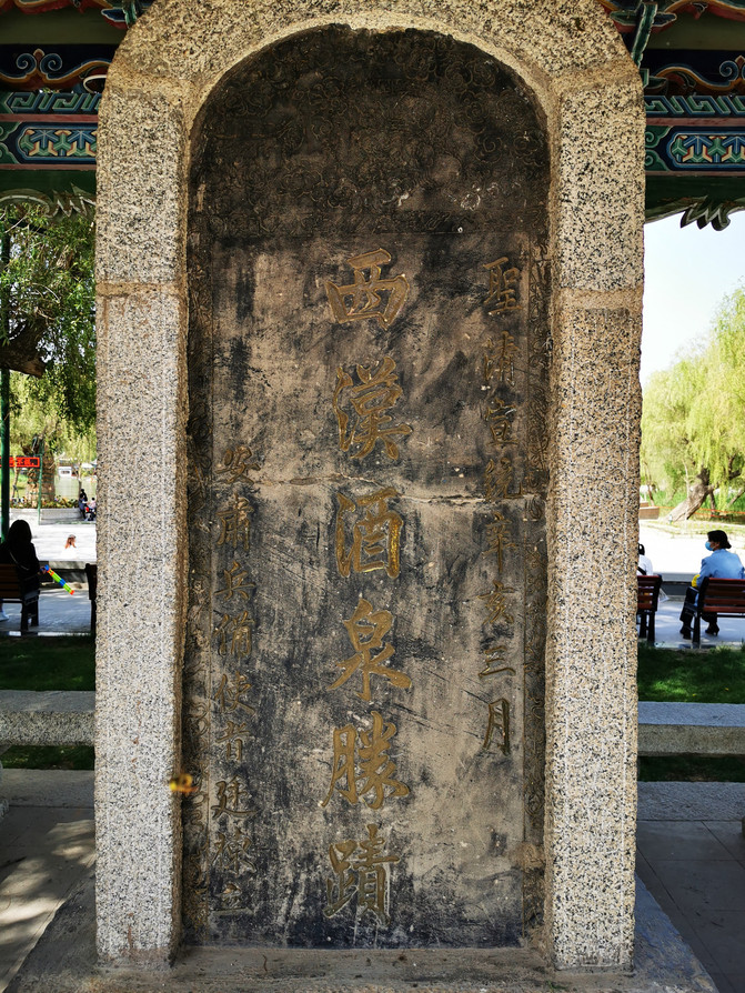 酒泉市酒泉公园在酒泉城东一公里处,有一座清宣统辛亥三月立的大碑,碑面刻有“西汉酒泉胜迹”六个刚劲的大字。石碑后有一清泉,名曰“酒泉”,距今已有二千年的历史。据传,汉将霍去病在河西击败了匈奴,捷报传到长安,汉武帝赏赐御酒一坛。霍去病为让将士们共尝美酒,下令将御酒倒入金泉之中,让三军畅饮。从此,金泉泉水便带有浓郁的酒香,故名“酒泉”。