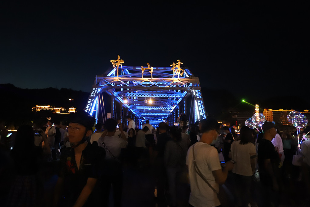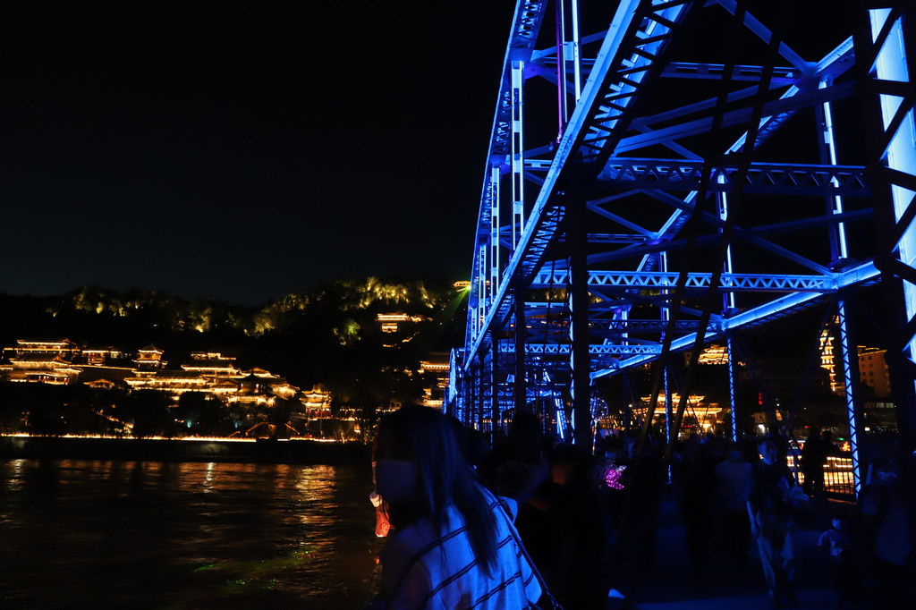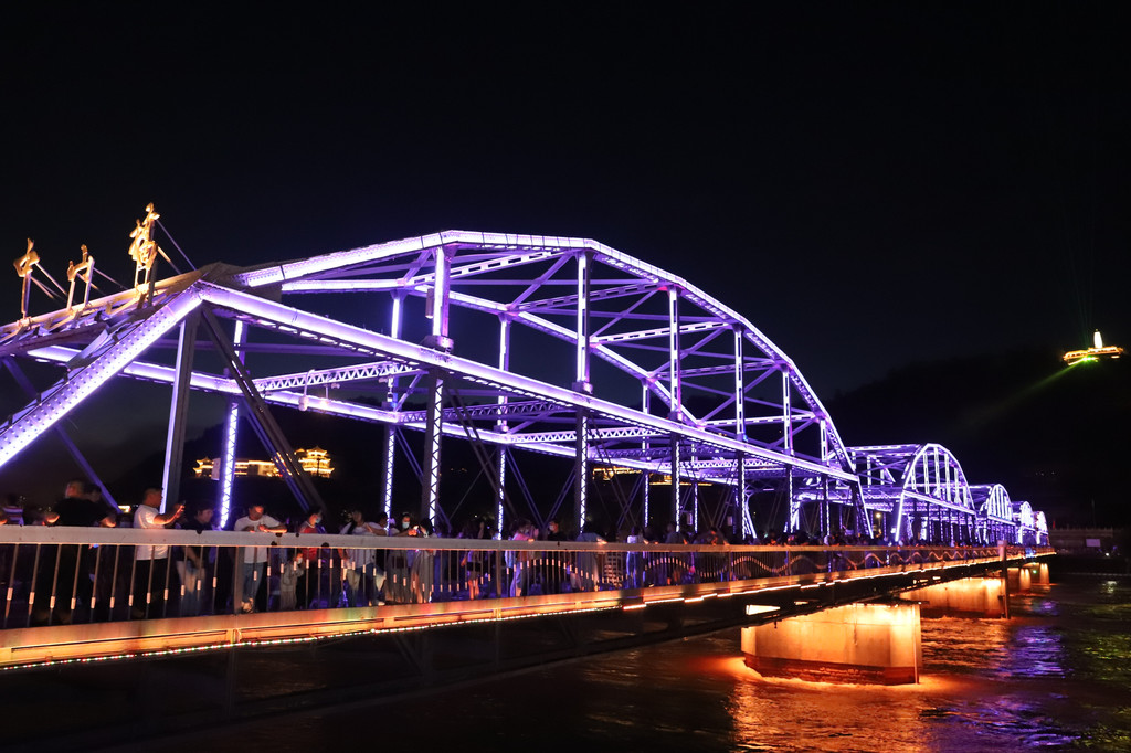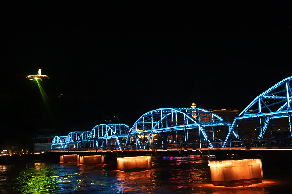 夜色下的黄河铁桥璀璨夺目,流光异彩,在彩色灯光的衬托和照耀下,显得非常庄重大气!铁桥的周边,是兰州市的闹市区,夜幕降临后,休闲的市民和游客在铁桥上或周边马路上擦肩接踵,悠闲游玩的十分惬意。
