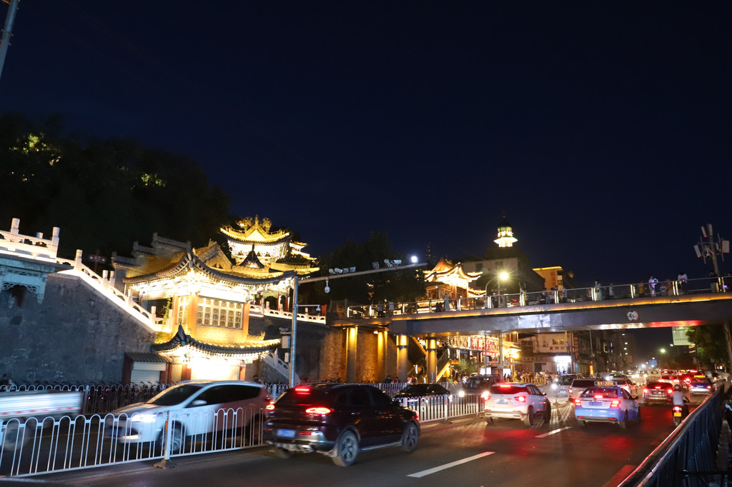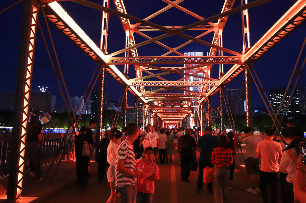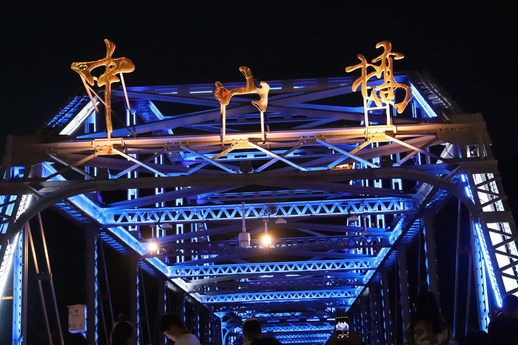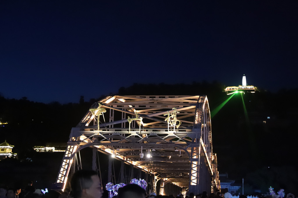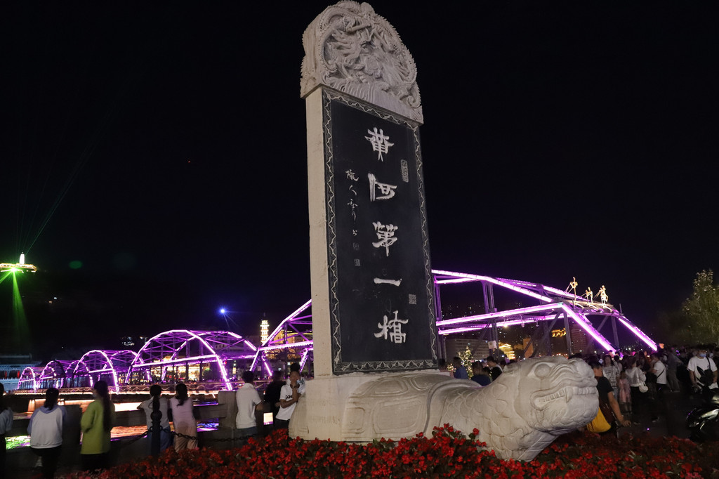 夜色下的黄河铁桥璀璨夺目,流光异彩,在彩色灯光的衬托和照耀下,显得非常庄重大气!铁桥的周边,是兰州市的闹市区,夜幕降临后,休闲的市民和游客在铁桥上或周边马路上擦肩接踵,悠闲游玩的十分惬意。
