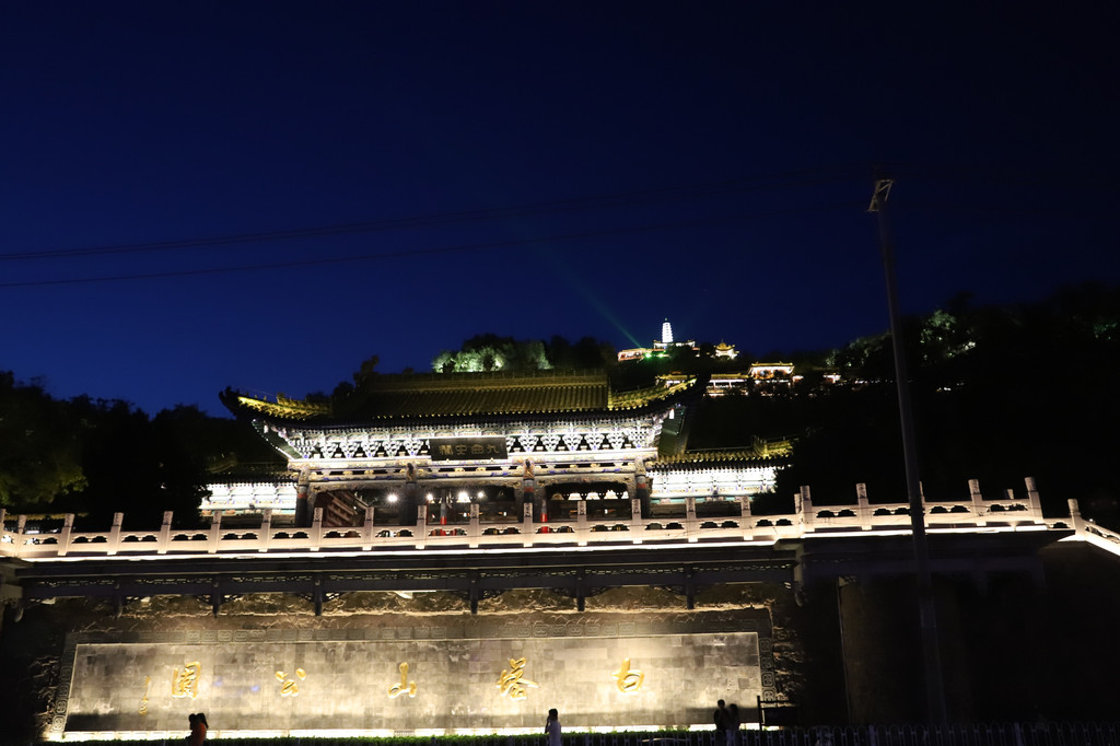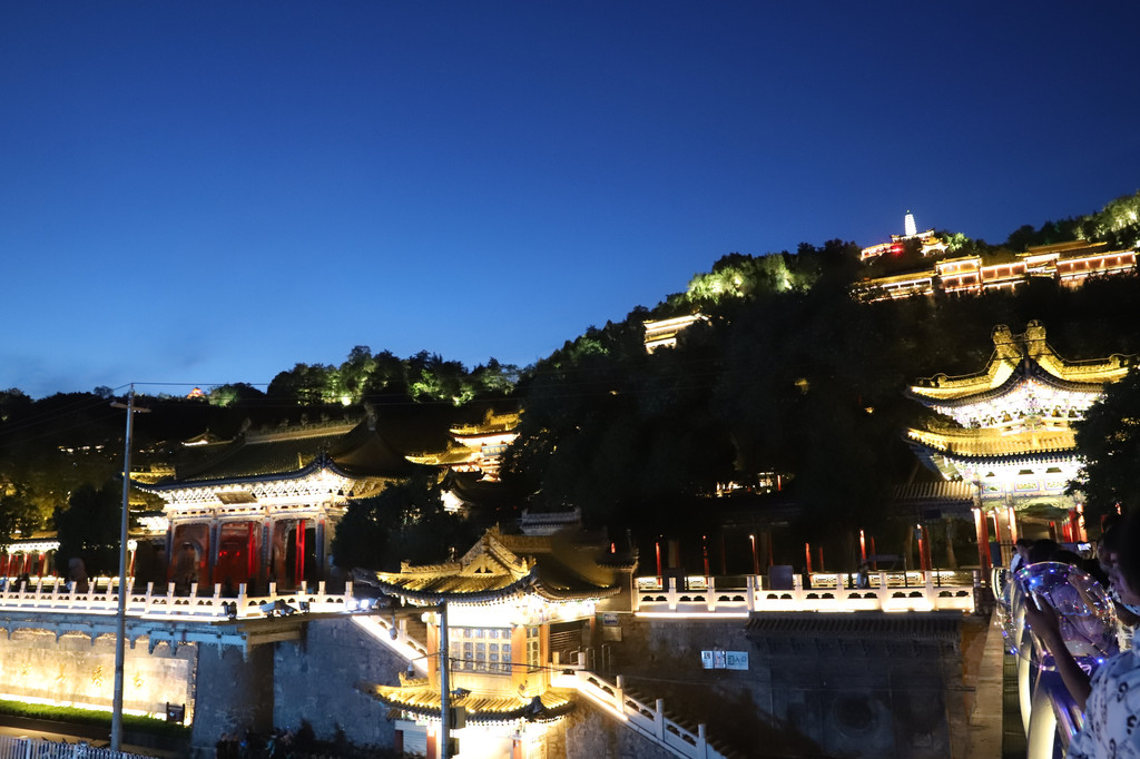 白塔山公园位于黄河的北岸,入口处与黄河铁桥相接,在灯光的映衬下,山上的建筑错落有致,非常雅致。