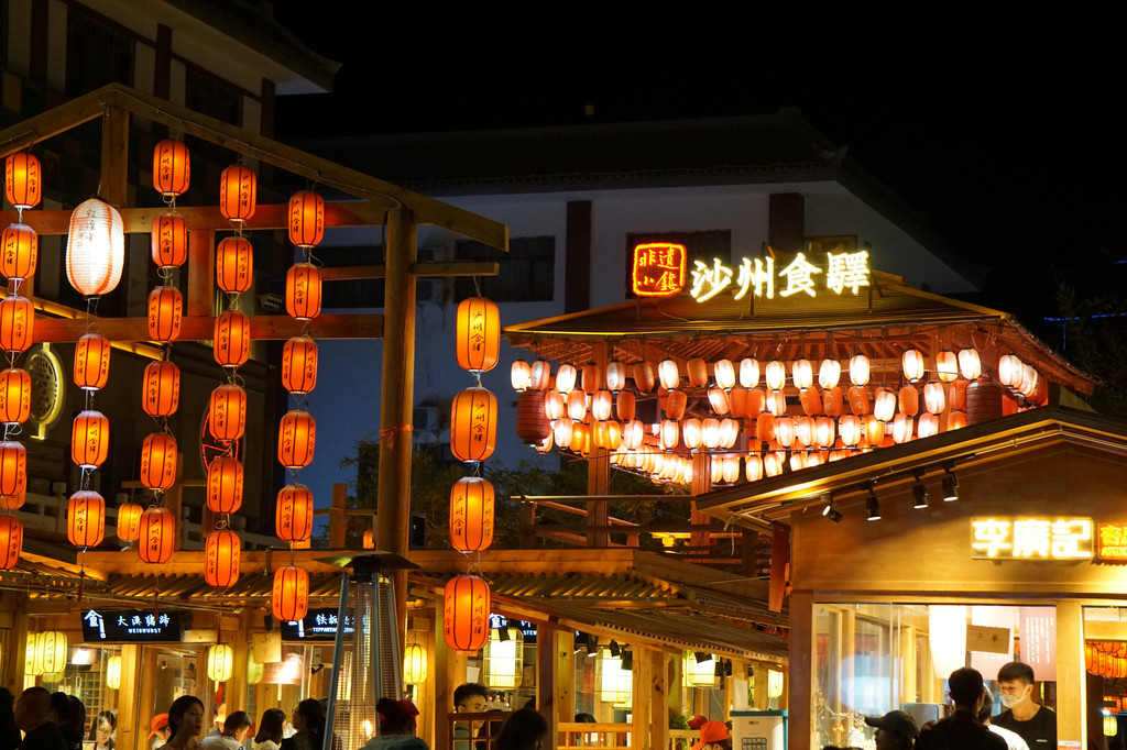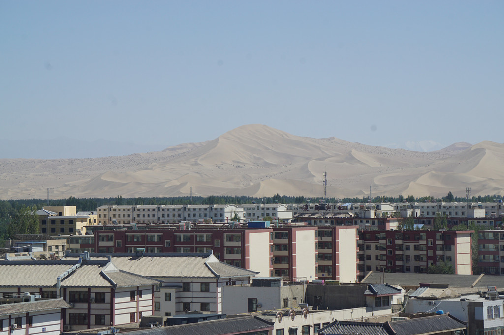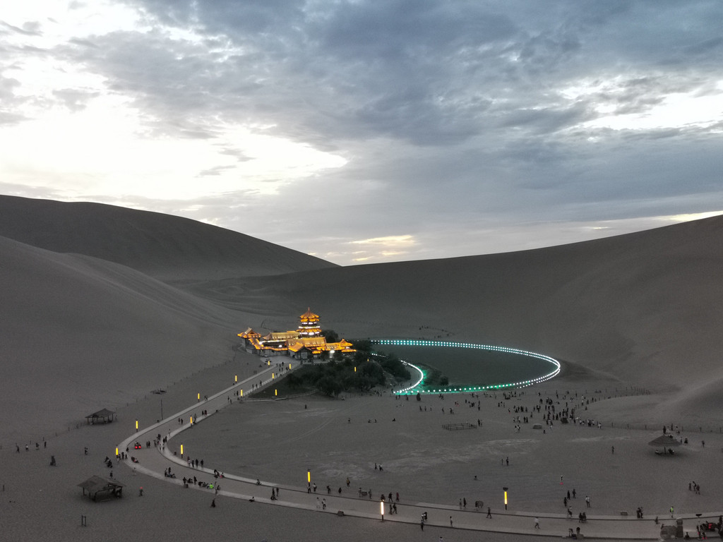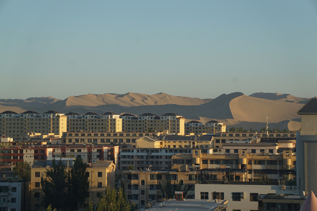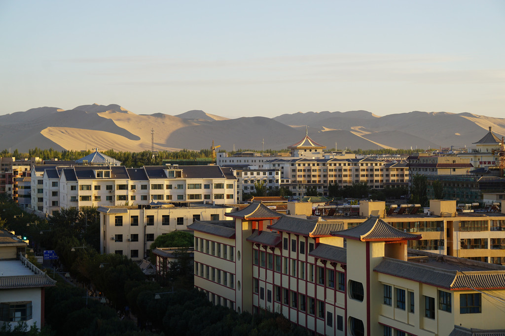宾馆就定在沙洲夜市边上,地理位置特别好,窗外就能看到鸣沙山