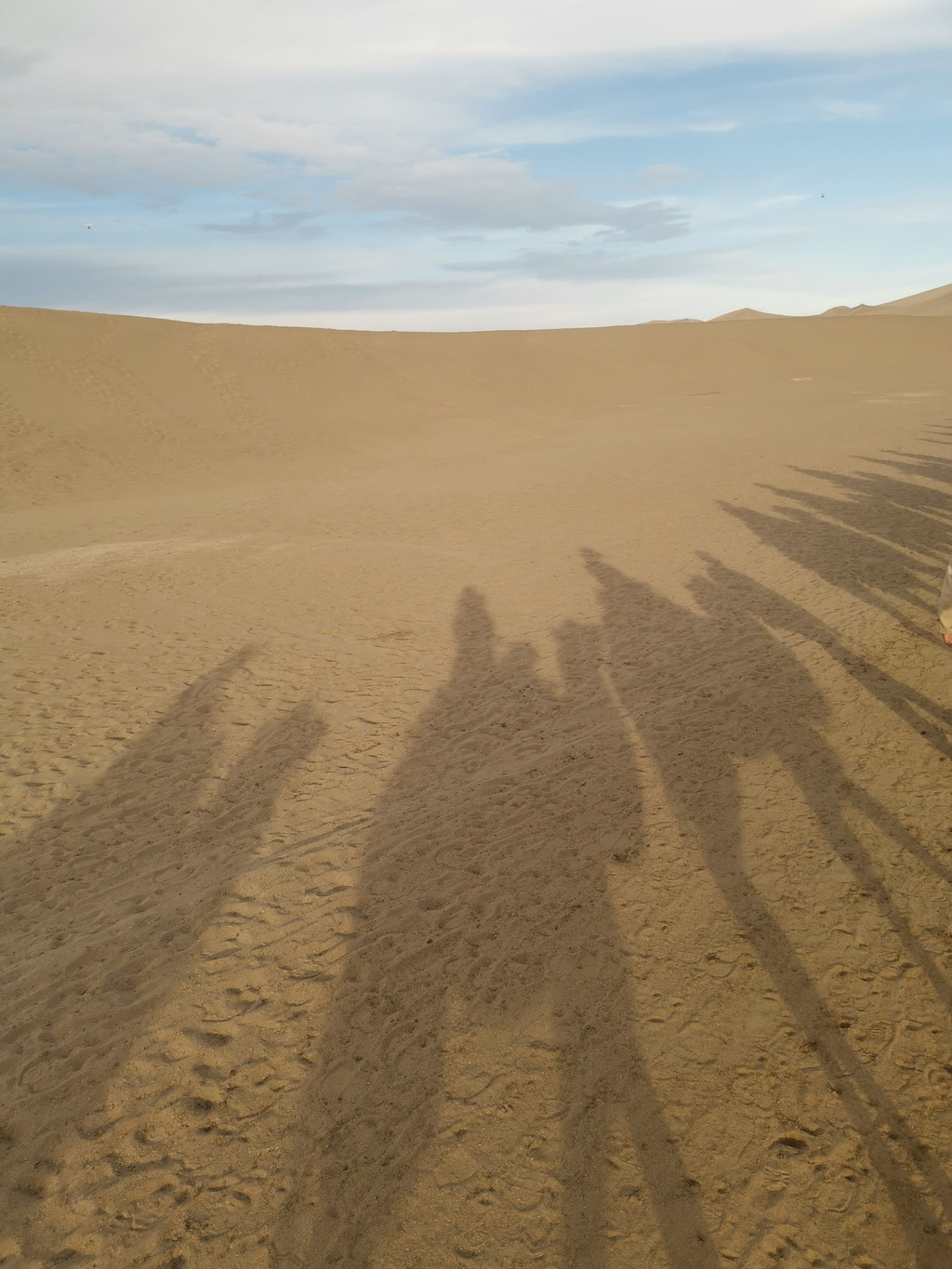 骑完骆驼,马不停蹄去爬鸣沙山,为了看日落,不过在沙子上爬真的很累,我们爬了一半,太阳眼看着落山,索性就此坐在沙子上看日落吧