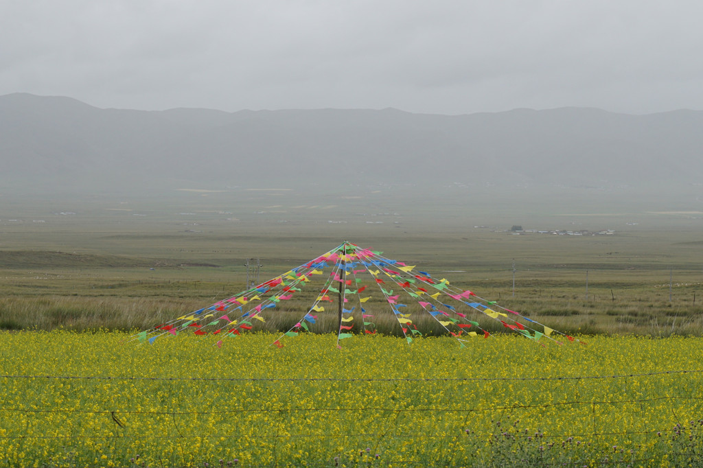 远远的还有很大一片一片的油菜花田,7月至8月是青海油菜花开的季节,我们到时很多都凋谢了。当地牧民会把油菜花田圈起来,里面摆上拍照道具就可以收费了。