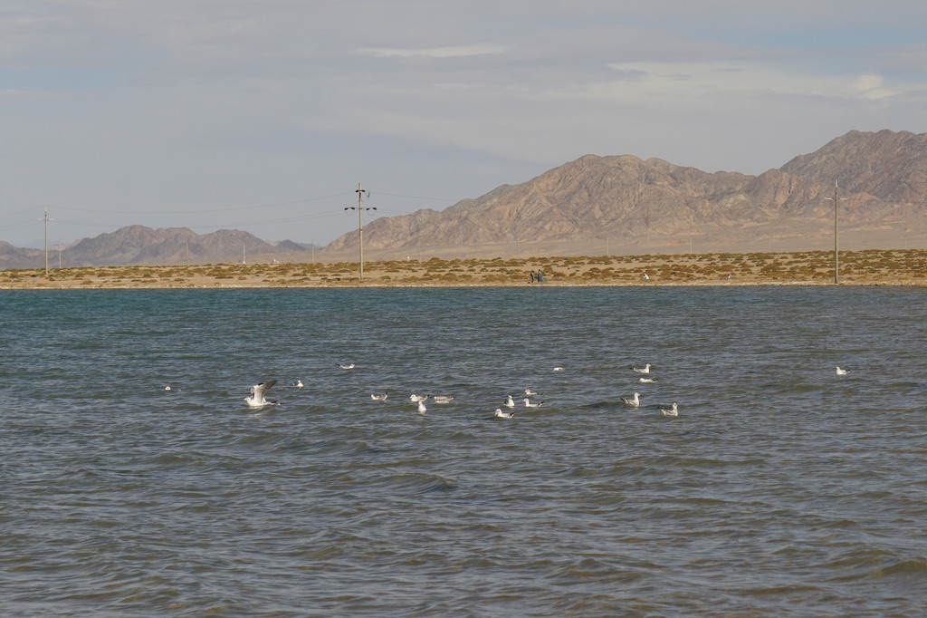 在茫茫西北戈壁之上,小柴木湖像是一座绿洲,远远便可看到绿意,湖水却是蓝得透彻,清得见底。湖边生长着一片半人高的芦苇,轻风拂过,摇曳婆娑,环境十分优美,与对面的茫茫戈壁滩形成鲜明的对比。