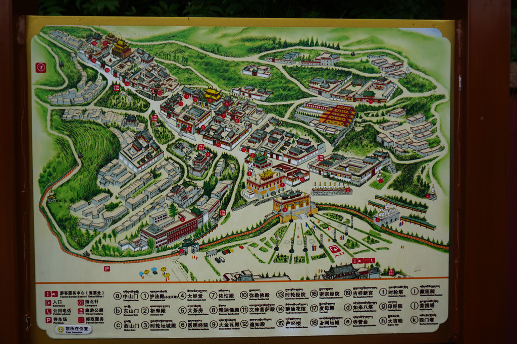 塔尔寺和内地汉传佛教寺庙在建筑布局上有着明显的不同:塔尔寺的建筑群不是中轴对称、纵深进入的。塔尔寺是由众多的大殿、经堂、佛塔、学院组成的古建筑群,各个经院、大殿、佛塔都不规则的分布在一个小山丘上。游客在游玩时,线路是比较随性的,而不是沿着中轴一路向前走。