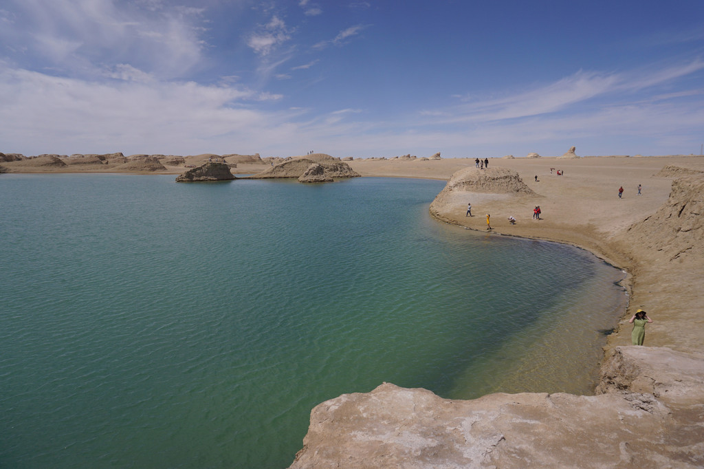 进入景区,先坐大巴到景区最深入,从里到外一站一站的下车玩,因为吉乃尔湖面抬升,逐步淹没北缘的雅丹群,形成了独特的水上雅丹,魔幻而神秘。据说水上雅丹这是全世界蝎子粑粑—独一份~