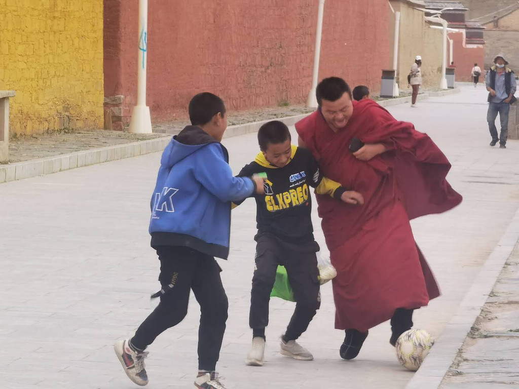 略略地看了黄河九曲第一湾后,我们就向下一站郎木寺进发,约11点30分到达郎木寺。郎木寺镇是甘肃甘南藏族自治州碌曲县和四川阿坝藏族羌族自治州若尔盖县共同下辖的一个小镇,白龙江穿镇而过,江北的叫“达仓郎木赛赤寺”,属于甘肃碌曲县;江南的叫“达仓郎木格尔底寺”,属于四川若尔盖县,两座寺庙均属藏传佛教格鲁派寺庙。江南的“达仓郎木格尔底寺”据了解目前有2000多僧侣,在那佛学院学习。我们参观了江北的“达仓郎木赛赤寺”。
