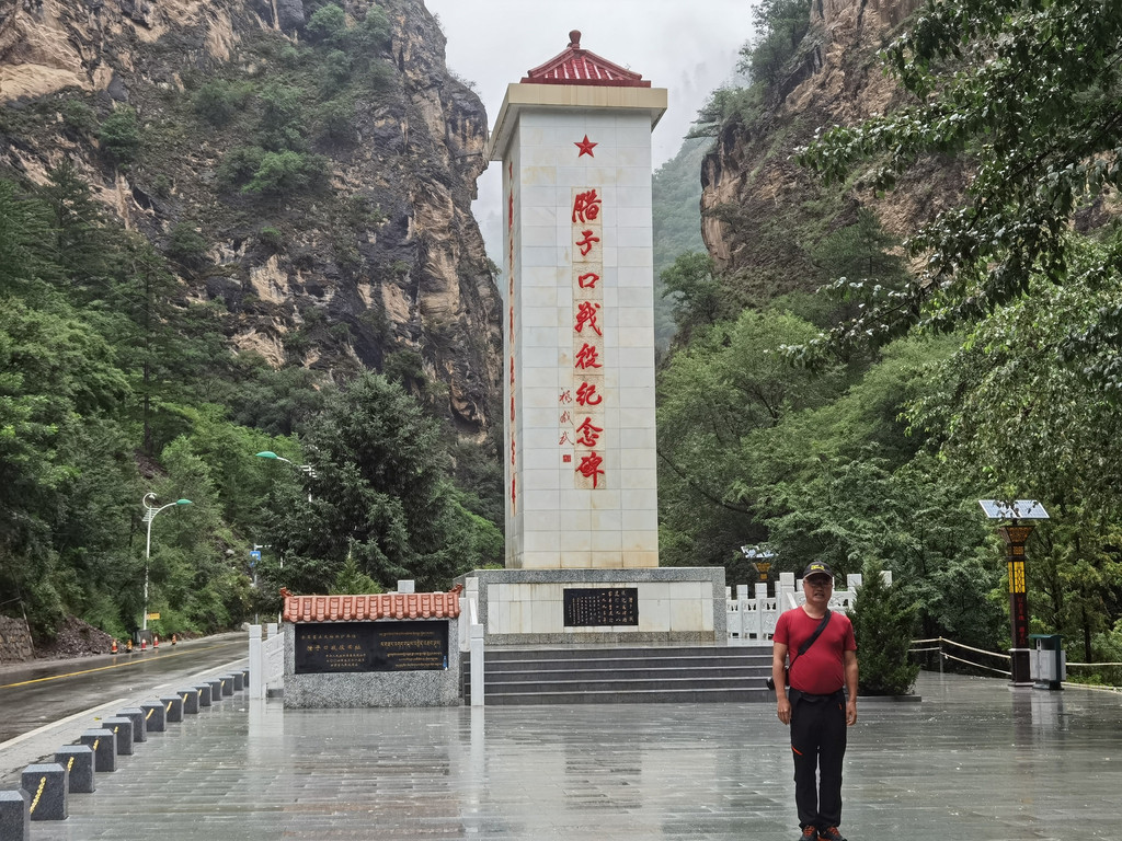 本来想在扎尕那民宿住一晚,综合考虑行程等因素,大家商量后决定去迭部县城找家酒店住,驱车约40分钟于19:00到达迭部县城。7月11日9点出发去腊子口朝圣,由迭部县城去往腊子口花了2小时,路上经过的路段两侧多数是坡度陡峭的山体,高耸入云,山上植被稀疏,国道每隔一段就有“注意落石”的警示。当年红军经过这艰险的路段,对于现在的我们是难以想象怎么克服困难的!11点到达了腊子口,红军当年如果冲不过去到达陇南,红军的命运就很危险了。历史总是给努力奋斗英雄的人开了一扇成功之门,红军打通了腊子口,实现了三大主力会师,扭转了危险的局面。