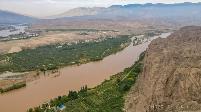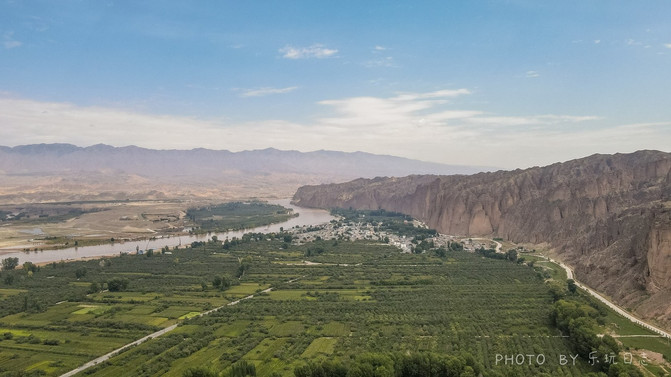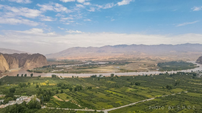 后面的黄河在此转了个大弯,而河道上,还有一个绿色的沙洲岛。