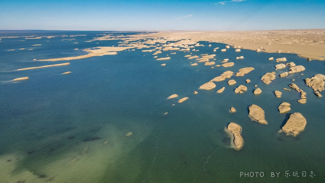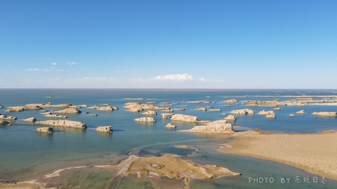 放眼望去,只见远处的蔚蓝的水面上,出现一艘艘如军舰一样长条状的小岛,与四周一望无际的湖面和戈壁滩互相交映,构成一幅让人无法令怀的惊艳美景。
