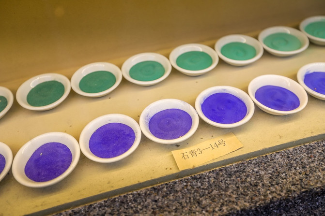 敦煌石窟博物馆里,展出的绘画颜料,都是用以天然矿石为原料,它经过选料、粉碎,除铁,研漂分级等程序,制造出适用于绘画所需深浅不同的各种颜色。