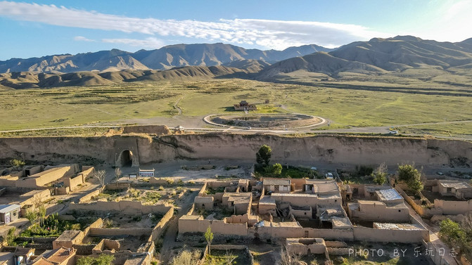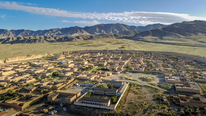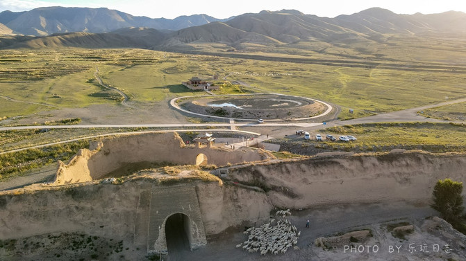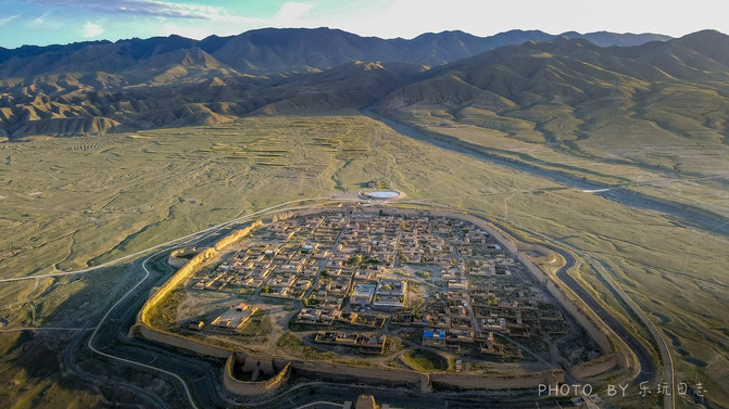 航拍下,雄浑的城堡四周是一望无际的戈壁荒滩,尽显大西北的苍凉。