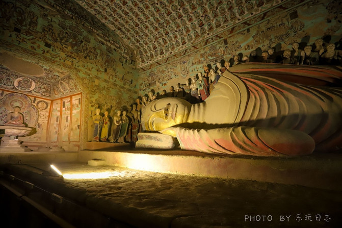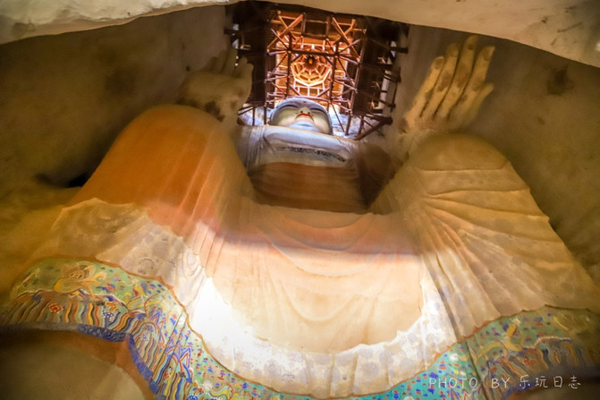 卧佛洞窟里面供奉的是佛祖释迦牟尼涅槃像,石窟中卧佛长15,8米,造型十分优美,神态安详,它表示的是佛祖释迦牟尼涅槃,解脱轮回、圆寂时候的样子。