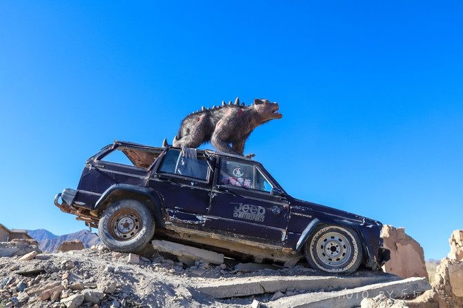 建筑物上,留下很多之前拍电影使用过的怪物道具,他们身上缠绕着铁链,嘴里长长的獠牙,看起来还是有几分恐怖的。