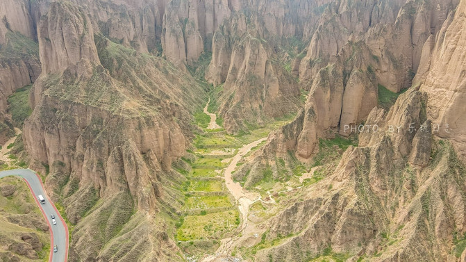 航拍黄河石林,可以看到黄河石林下面的绿洲面积挺大的,这和荒凉的石林形成巨大的反差。