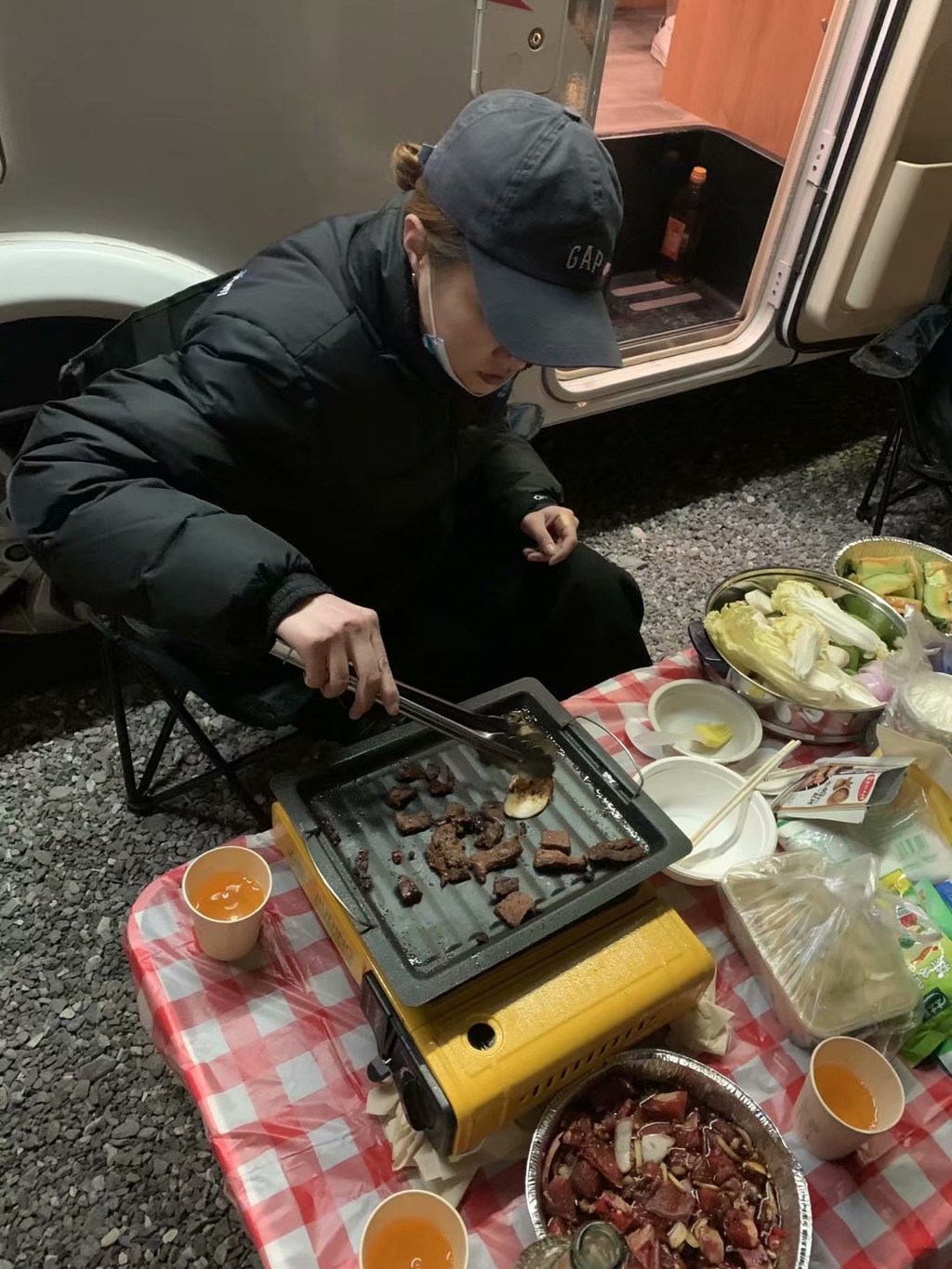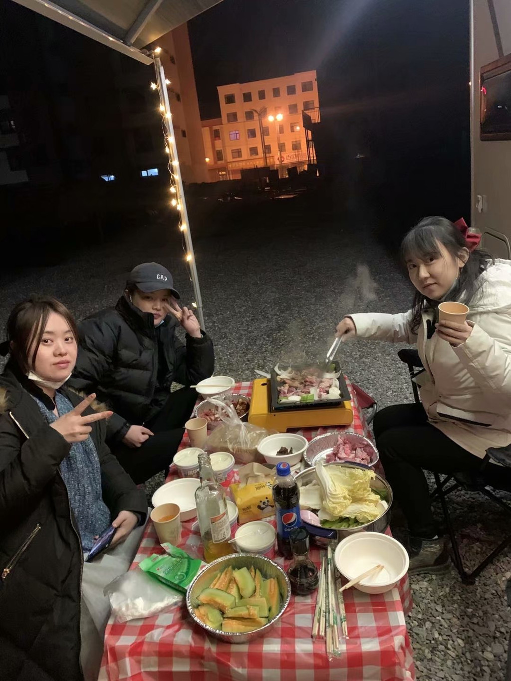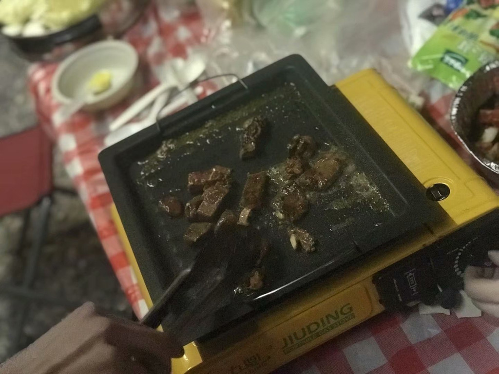 晚上赶到大柴旦镇,安顿好酒店住宿,给房车加水加电,顺便去附近烧烤店买了2kg羊肉(60元/kg),2kg牛肉(50元/kg),以及一些蔬菜。不得不说,一路上,我们遇上的西北当地人,菜鸟驿站,酒店前台,快递小哥,都很朴实善良,会主动帮助我们,商家也非常实在,2kg的肉,实实在在2kg,我们4个女孩子,分两顿都没吃完。4个人分配完任务,各自忙各自的事,但一顿忙活下来,也将近晚上11点了。遮阳棚支楞起来,装饰灯挂起来,桌椅展开来,烧烤盘点起来,就这样,我们在西北的晚上,近11点的深夜,酒店的停车场(跟酒店打过招呼)内,开始了我们的烧烤大餐。也许是氛围到位,也许是西北的牛羊肉本身特别美味,也许是酒不醉人人自醉,我们吃着喝着,听着油滋滋冒泡的响声,聊着笑着,这顿烧烤会变成特别的回忆刻在我们的脑海里。凌晨一点,收拾完装备,整理了垃圾,回酒店睡觉。