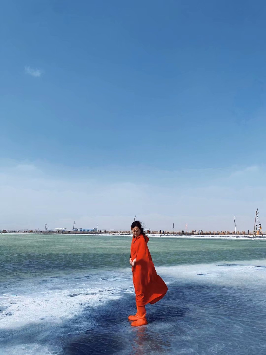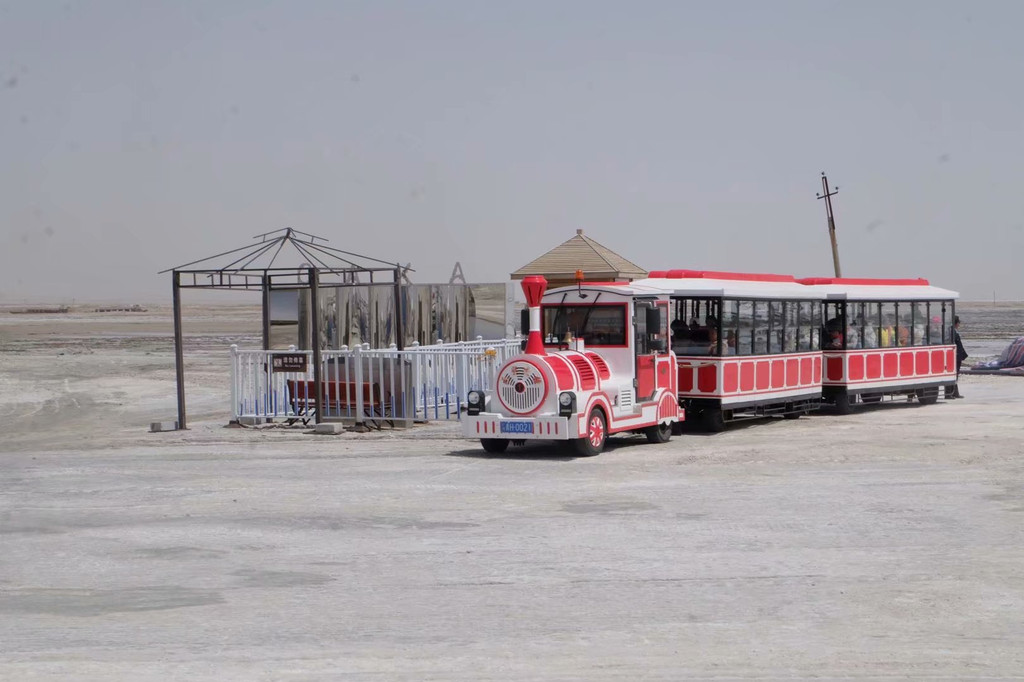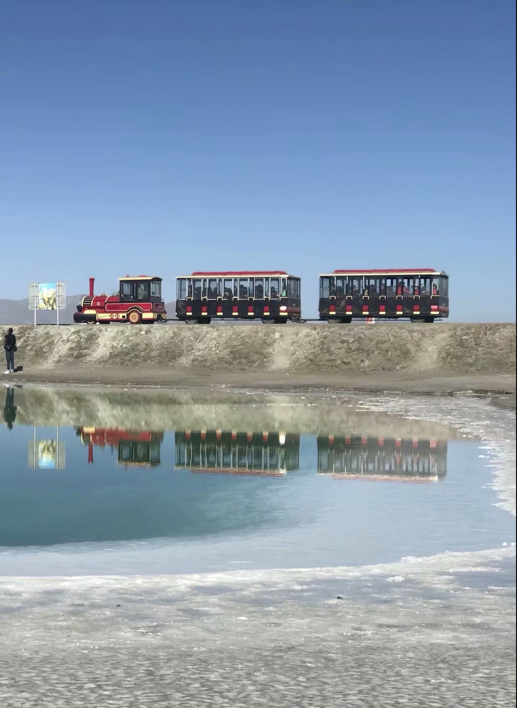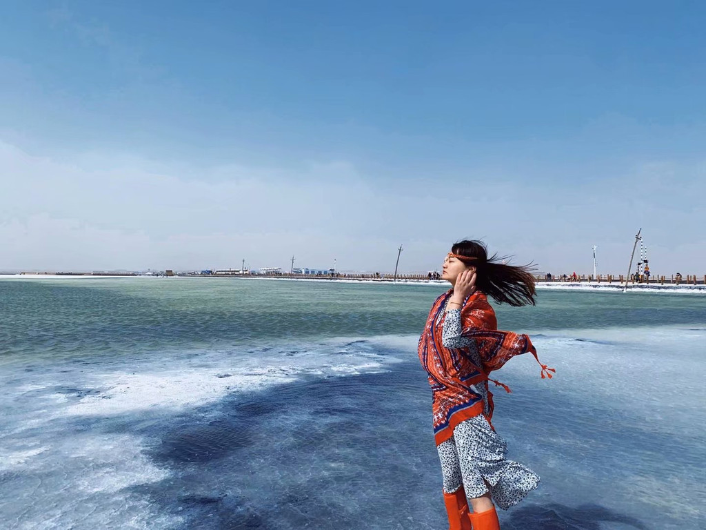 之前我对青海湖其实抱着很大的期望,我一直觉得青海湖会无比雄阔美丽,包括环青海湖骑行也觉得浪漫无比,但一路下来,没有特别的美景让我想驻足观赏,也许我来的不是时候,油菜花没开,鸟岛不开放,所以看不到灵动的青海湖。我只觉得外面风大的不行,接近橡皮山垭口3800米的高度有点高反前兆,房车反座使人很不舒服。直到到达我们旅行的第一个重要景区—茶卡盐湖。茶卡盐湖也许是青海环线必到的一个景点,我原先计划游玩茶卡盐湖时间为2-3个小时,但到了才发现,门票售票点距离景区还有很长一段路,需要坐摆渡车。下了摆渡车,还得步行一段路,到了景区还得买小火车票,整个过程下来已经将近2个小时了,非常浪费时间,这还是不需要怎么排队的淡季,可想而知旺季的费时费力。茶卡盐湖门票60(浙江人免票),小火车单程50,可以的话,不太建议坐小火车,特别是大风天没有窗户的小火车,冻的我们都没脾气了,赶紧的~~毁灭吧~~而且中途不准我们下车,一直把我们拉到最末站,想徒步走出来都不行,只能坐返程火车。