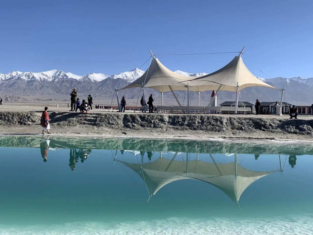 早餐后,前往翡翠湖。其实在西北环线上,有两个翡翠湖,大柴旦翡翠湖和茫崖翡翠湖。两个都去过的人,都说茫崖翡翠湖更美。但我只去过一个大柴旦翡翠湖,已经美的让我印象深刻。这里也是电影《送你一朵小红花》的取景地,可以打卡千玺弟弟同款。今天天公作美,到了翡翠湖以后,天气非常好,远处的雪山倒影在水中,层峦叠嶂,近处的翡翠湖,用色卡上难以定义的蓝和绿,诠释着人间绿宝石。当无人机用上帝视角,向我们展示各种蓝的绿的黄的盐湖,像上帝打翻的调色盘,异常美丽。