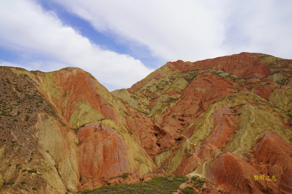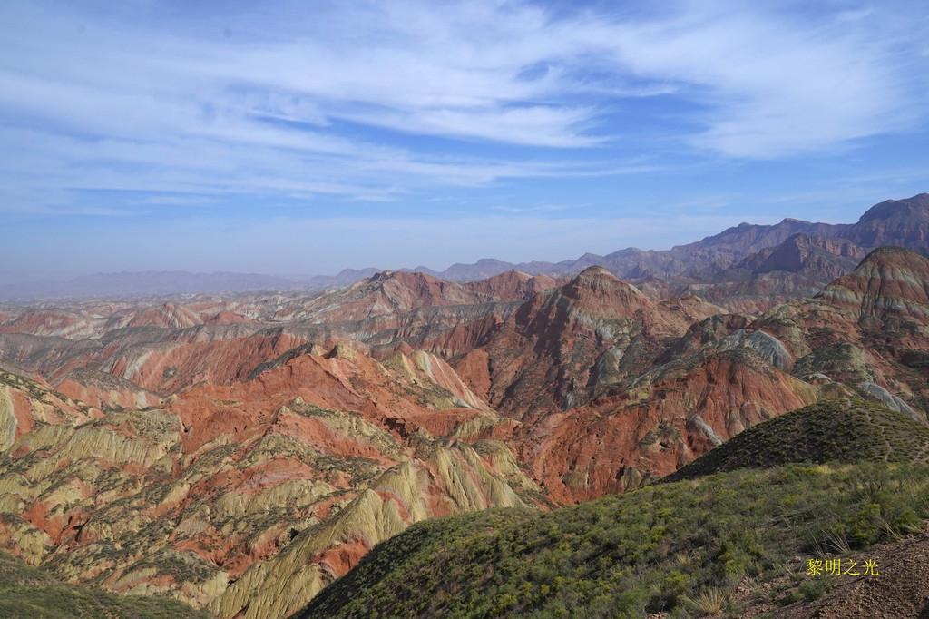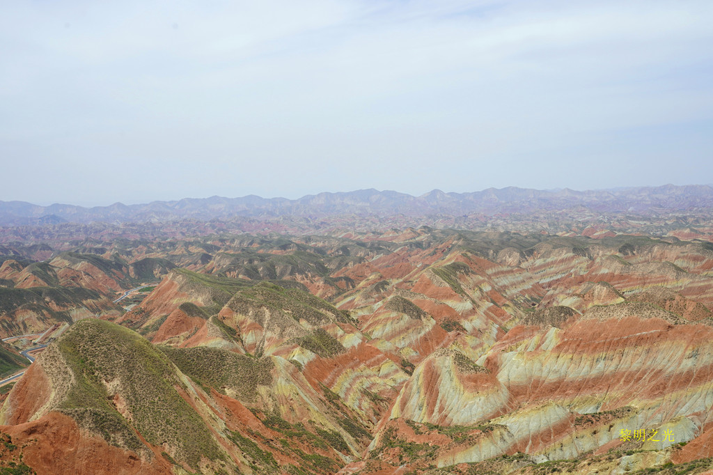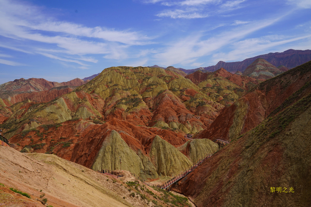 这里彩色的千岩万壑仿佛触手可及,色彩斑斓的丘陵仿似上帝的调色板,矿物岩石在阳光的照射下,各种色彩浓烈地交织在一起,色调或如波浪顺着山势起伏,或从山顶倾泻而下,山形肌理状若泼墨山水,美不胜收,又是一阵狂拍。