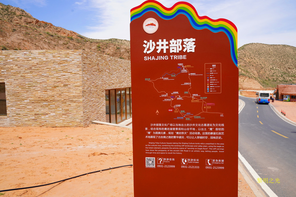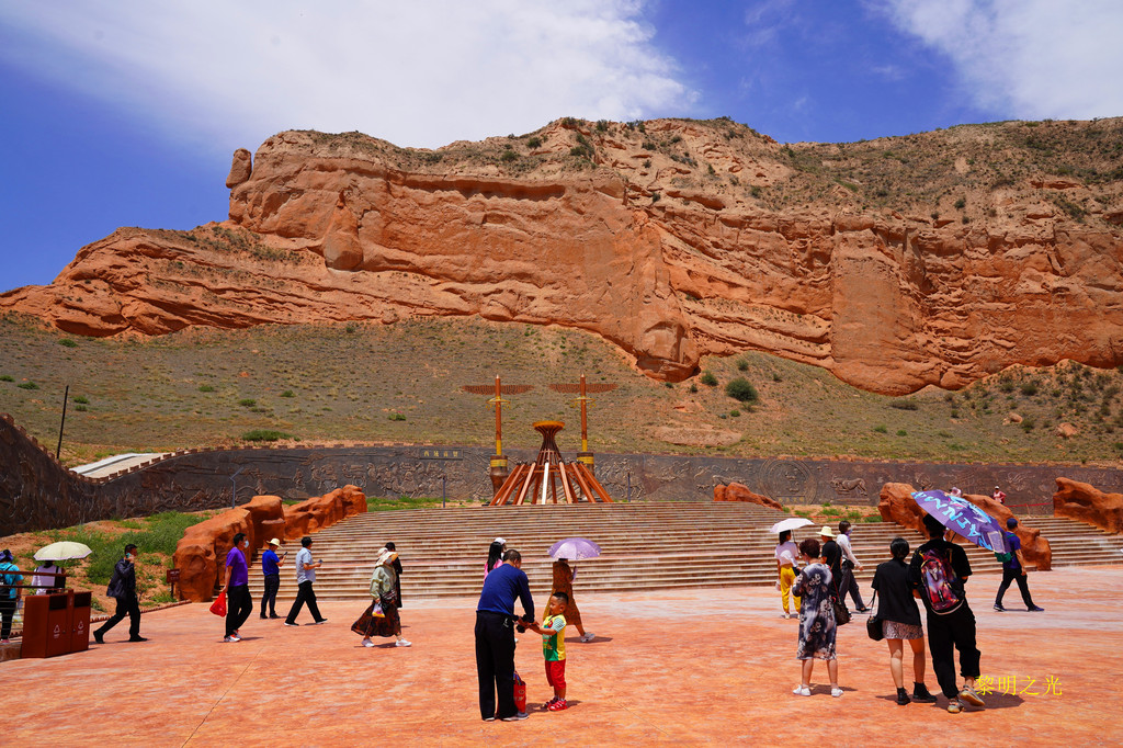 这里是一个广场,有一块砖红色的巨大的崖壁,有一片片壮观的浮雕壁画,介绍了本地的历史传说,广场很壮观,也很美,估计以后在这里可以开展很多表演活动。据介绍沙井部落广场以当地出土的沙井文化古墓遗址为文化线索,结合鹰岩崖壁景观,以出土“鹰”首杖的“鹰”为图腾元素,规划了“鹰岩祭天”活动场景。欣赏了骆驼峰崖壁景观,了解了沙井文化后,14:20我们从沙井部落乘坐出景区的大巴车,14:30到达停车场,啊呀,车真多。