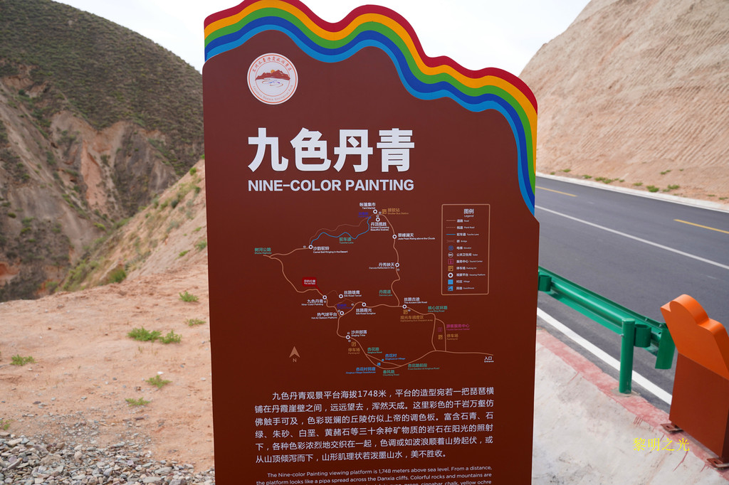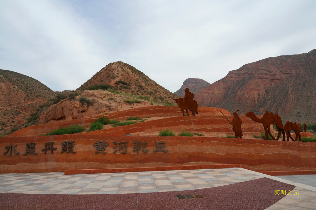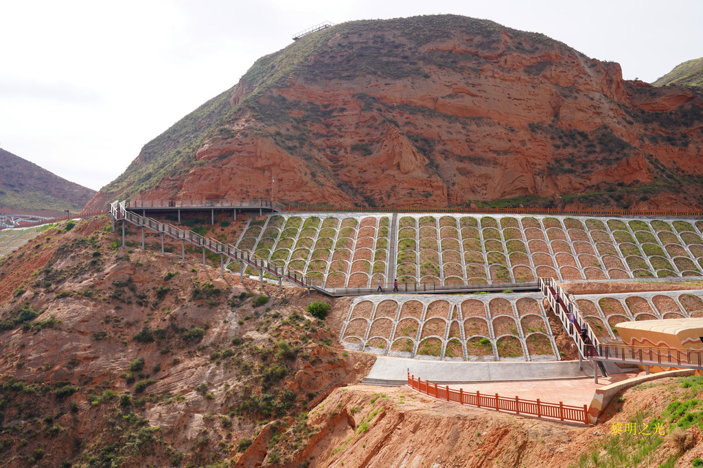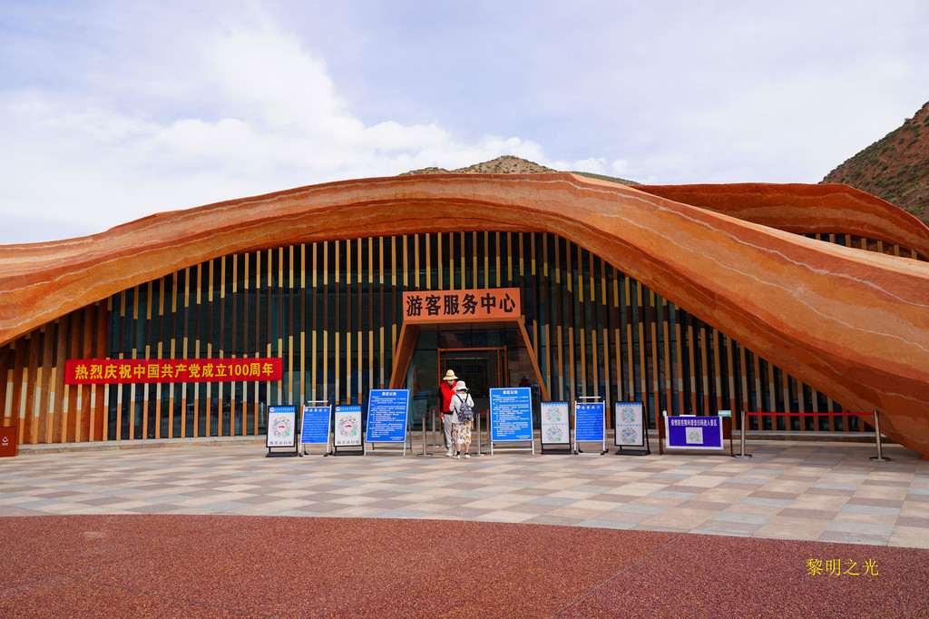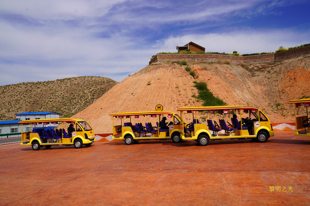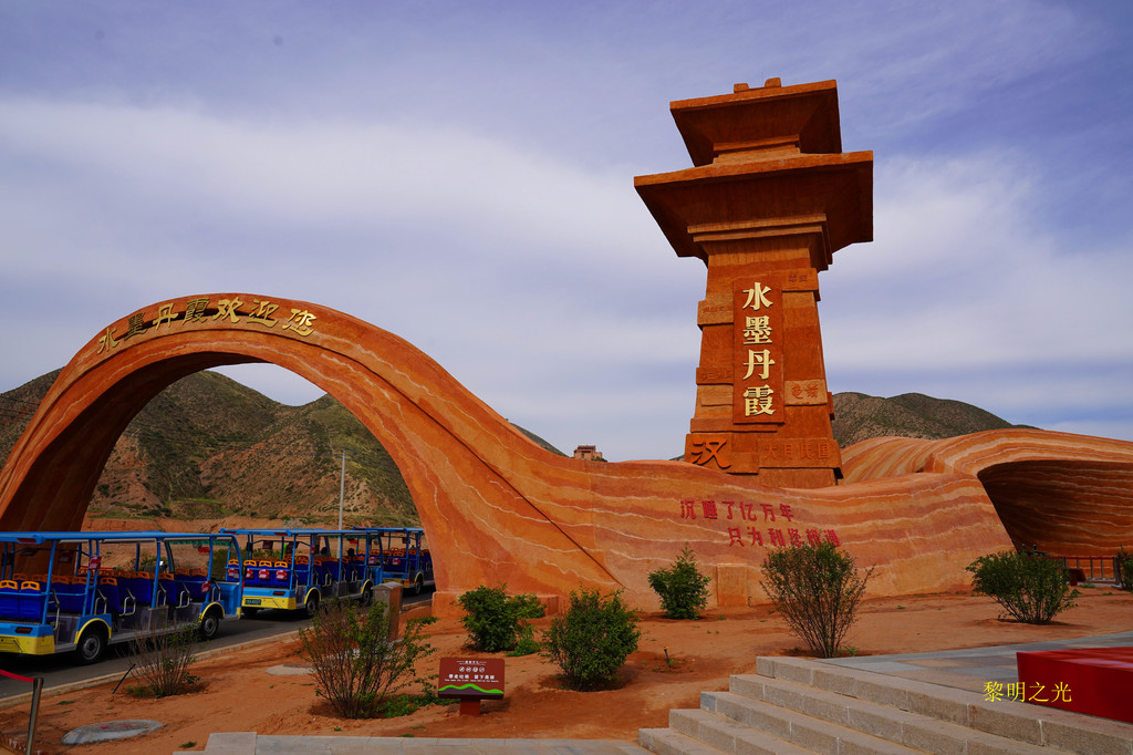 在临夏折桥加了油后,走折达路,过永靖县城,沿省道105到兰州南滨河西路,过西沙大桥,8:40我们到达水墨丹霞景区,露天停车场很大,部分还在修建中,停车场周边全是典型的西北山脉,几乎没有植被,土红色的,已经有一点丹霞的味道了。停车场车辆不是很多,我们直接开到了简易入口处,停好车后,就在车上吃了自带的面包、鸡蛋。9:00经测温、验健康吗进入,走了300米左右的简易通道,到达景区大巴乘车点,因人不多,我们在大巴上等了几分钟,来了一个十多人的旅游团队后,大巴才开始启动,大巴是免费的。大概七八分钟左右就到了水墨丹霞景区入口,下了大巴车后,可以看到巨型的水墨丹霞标志物,这里有游客服务中心,再次验健康吗,出示身份证,购买了景区观光电瓶车票,每位20元(如果提前在微信上已经购买,直接走电子票通道检票即可),景区门票免。我们在这里照了几张相后,就坐上了景区观光车电瓶车。