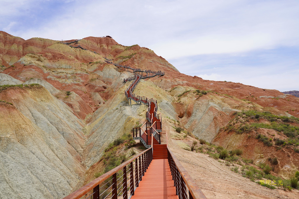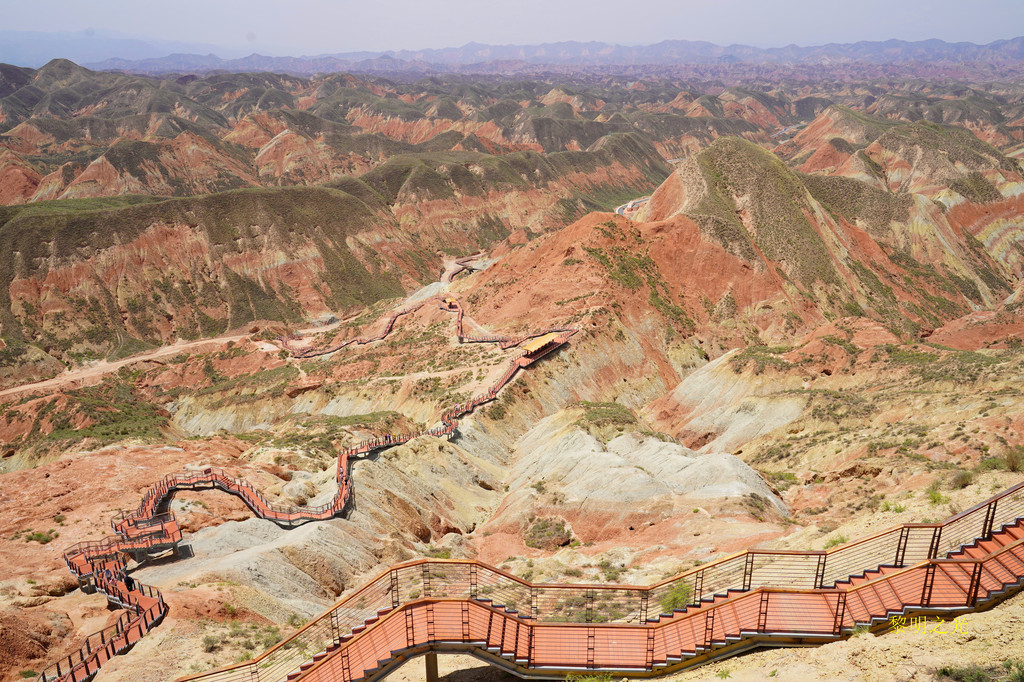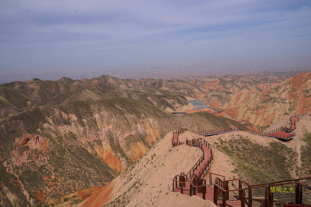 离开平台,沿着下行的栈道前行,景色又自不一,真是一步一景。沿着一条通向丹霞深处的栈道,我们到达了丝路雄鹰观景台,观景台有两层,登上高层,极目远眺,起伏的黄色山峦上一抹抹赤红、赤黄,绵延起伏,瑰丽壮观。