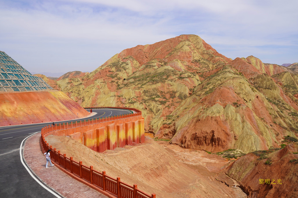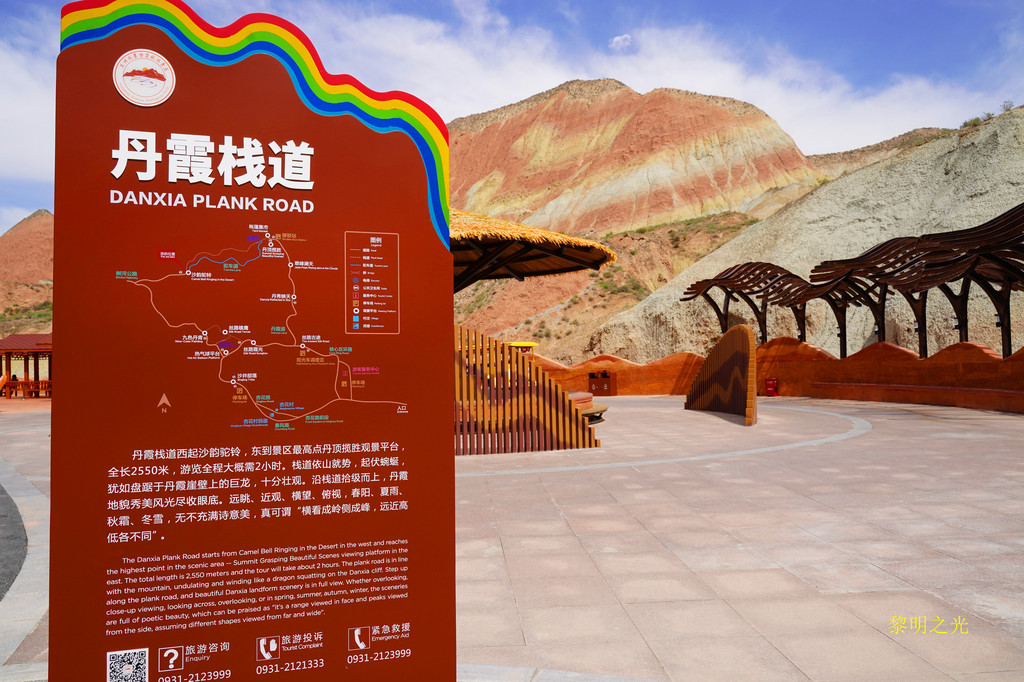 9:16到达第一个观光景点丝路霞光,观光平台的墙面是用五彩的小石头装点的,十分的艺术,非常的耐看,平台上放置了桌椅,供游客休息,站在平台上,第一眼会震撼到你的感官,前方连绵的山峰呈现出红、黄、橙、绿、褐、白、灰等多种色彩,层理交错、色彩斑斓,在蓝天白云的衬托下,好似一幅壮丽的水墨画卷,真的太美了!太美了!我们被景色深深吸引,不断的拍照、欣赏。